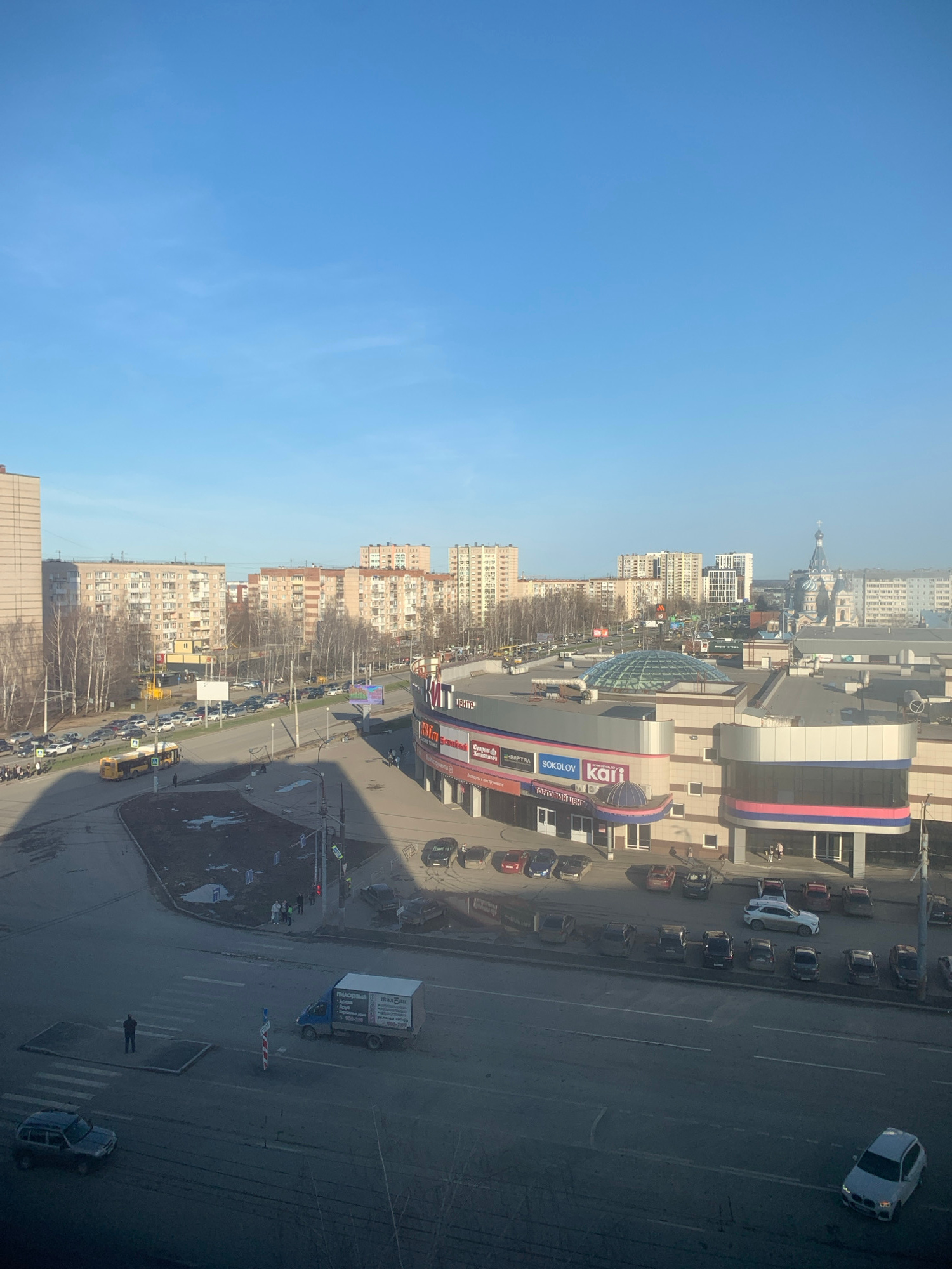 A high-angle view of a city street in Izhevsk, Russia, features multiple buildings, including a shopping mall with the word "kari" visible. A road runs along the right side of the frame, with parked c…read more