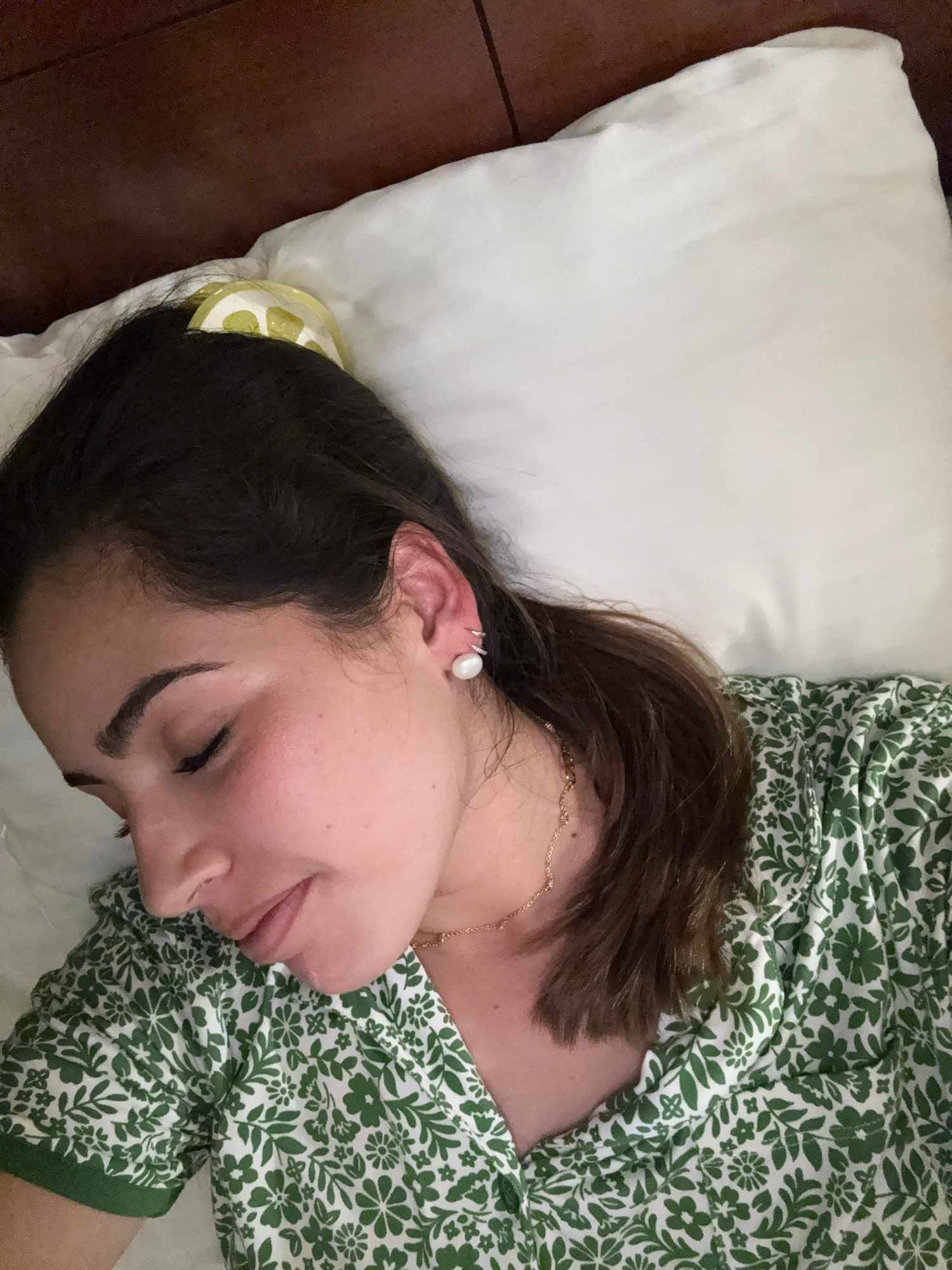 A woman is sleeping on a white pillow with a green and white floral dress. She has dark hair and is wearing an earring. A lemon-shaped hair clip is visible near her head. The location appears to be inβ¦read more