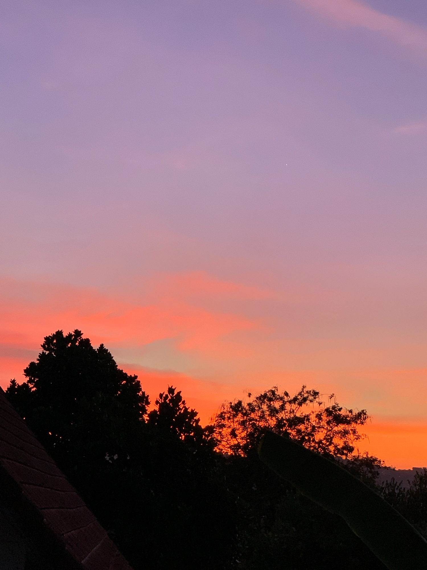 The image shows a view of the sky at sunset in บ้านบางรักษ์, Thailand. The sky transitions from purple on the left to orange on the right, with streaks of orange and pink in the center. The silhouette of trees occupies the right side of the image, partially obscuring the view of the sky. A small, bright spot is visible in the purple portion of the sky, potentially a star or planet. A portion of a dark, tiled surface is visible in the bottom right corner. | Open Wire