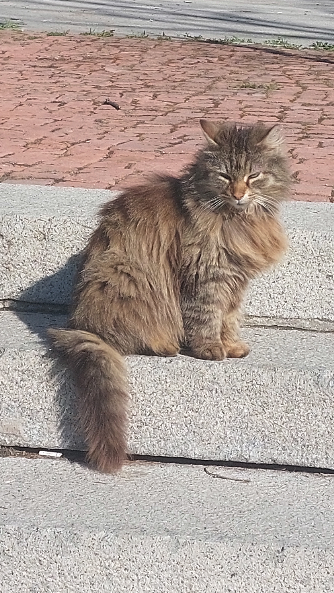 A long-haired, tan and brown cat is lying on its side on a concrete surface with joints. The cat's eyes are closed. To the left of the cat is a red-colored brick surface, and a few blades of green gra…read more