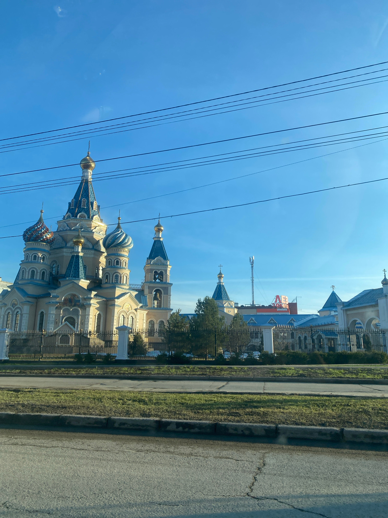 The image shows a view of the Alexander Nevsky Cathedral in Izhevsk, Russia, taken from what appears to be a moving vehicle. The cathedral, with its distinctive onion domes, is fenced off and located…read more