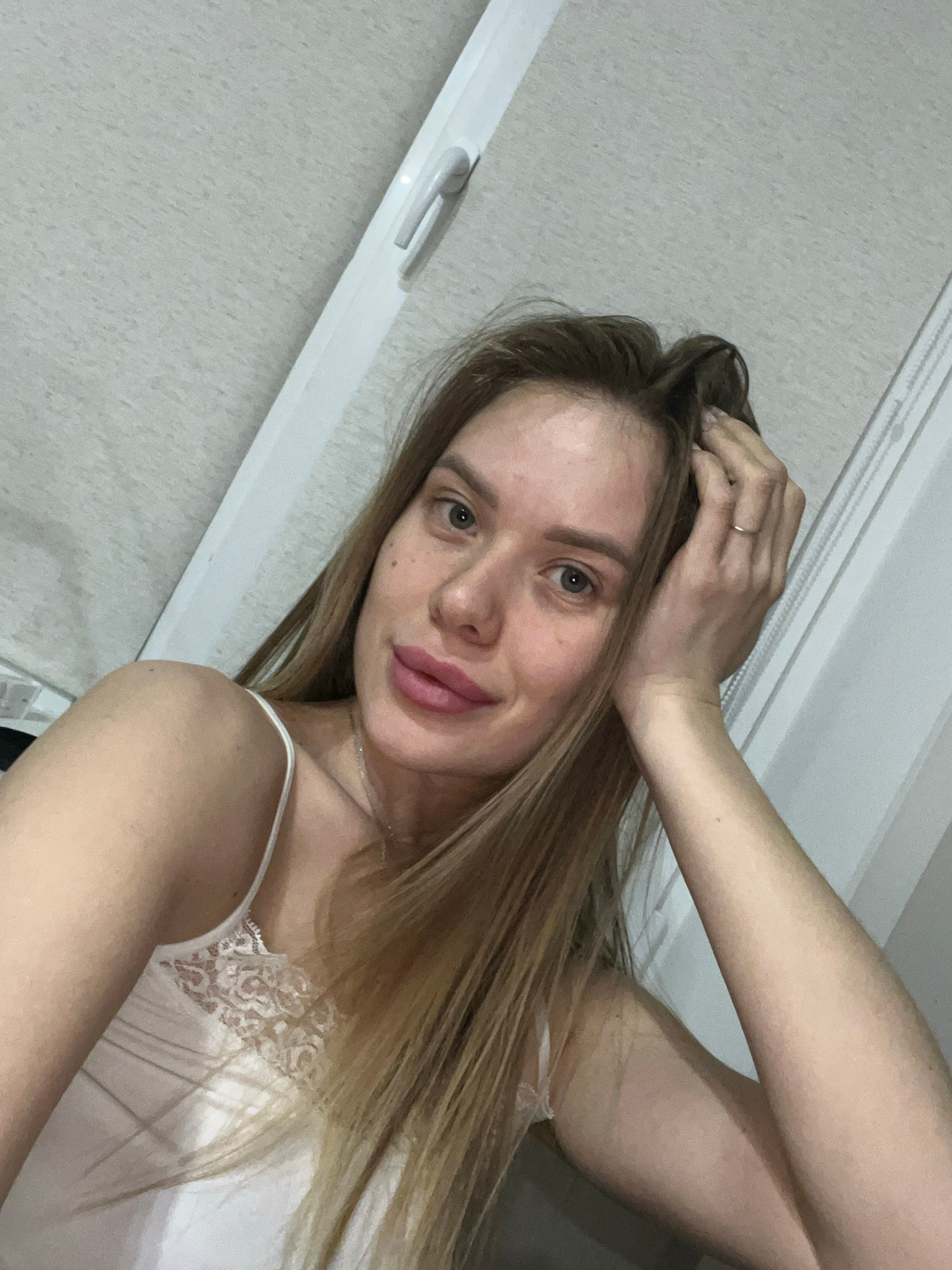 A light-skinned woman with long blonde hair poses for a selfie indoors. She has her hand on her head and wears a white lace-trimmed tank top. The background shows a gray wall and a white window frame.…read more