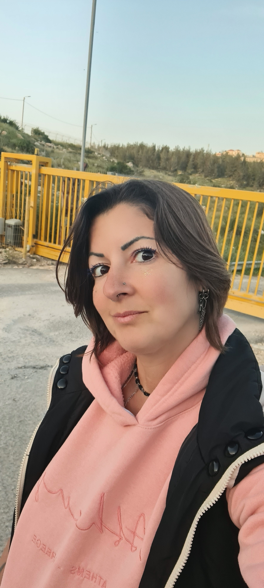 A woman poses outdoors in Lachish Regional Council, Israel. She wears a pink hooded sweatshirt with the word "Athens" and "Greece" on it, a black jacket, a chain earring, and multiple nose piercings.…read more