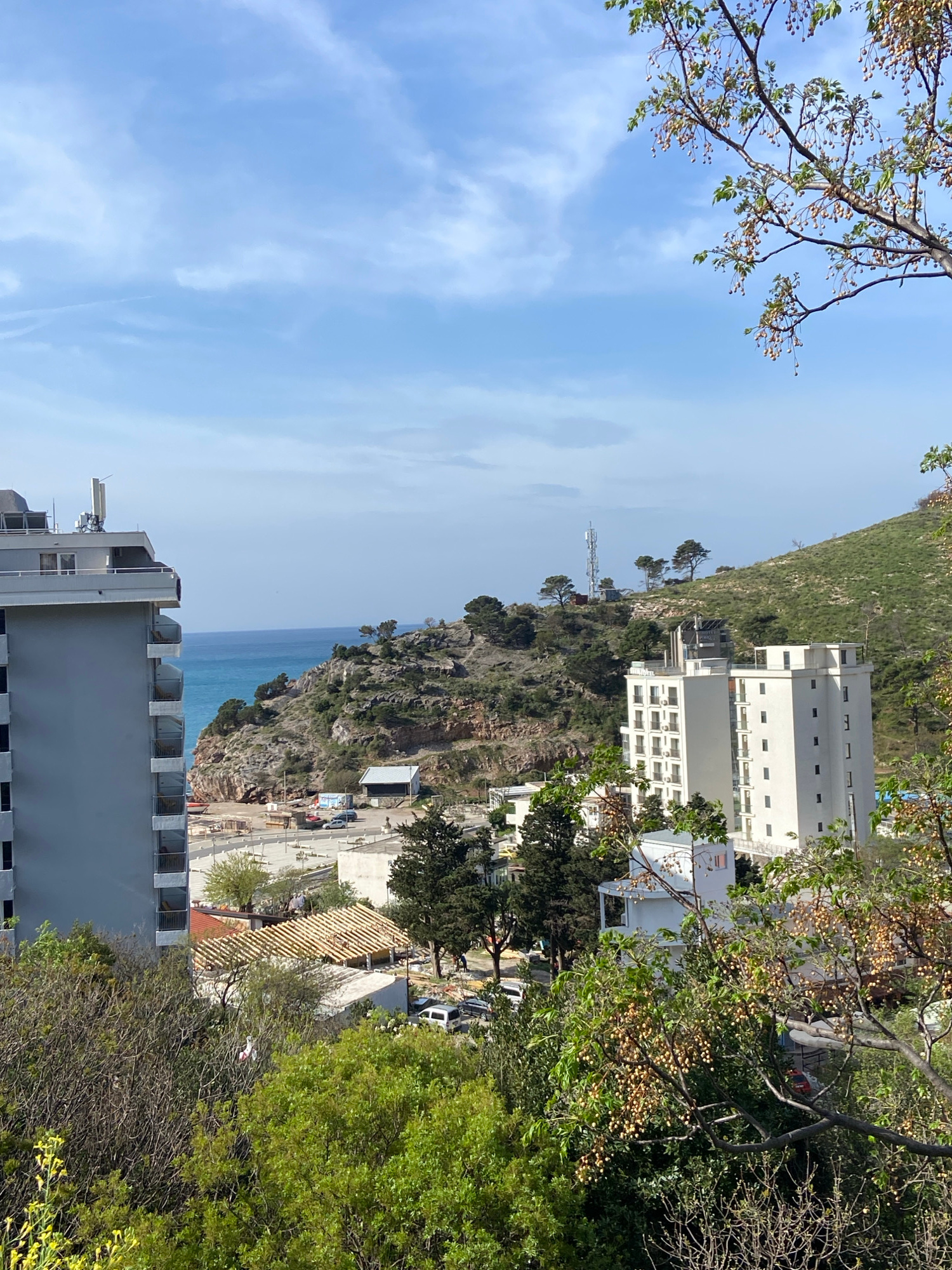 The image depicts a coastal scene in Sutomore, Montenegro, oriented vertically. A blue sky with wispy clouds occupies the left side of the frame, transitioning to a view of the Adriatic Sea. Along the…read more