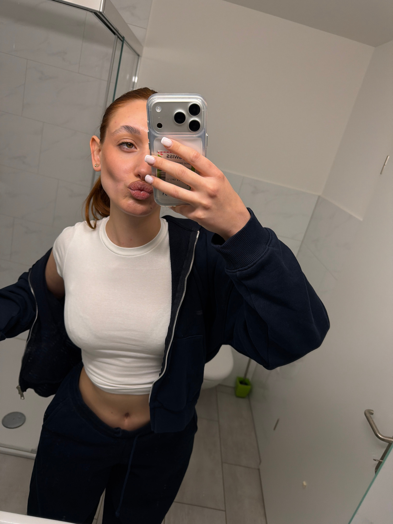 A person is taking a selfie in a bathroom. The person is wearing a white crop top and a dark blue zip-up jacket. The background consists of a white toilet, and grey tiles, and marble walls. The photo…read more