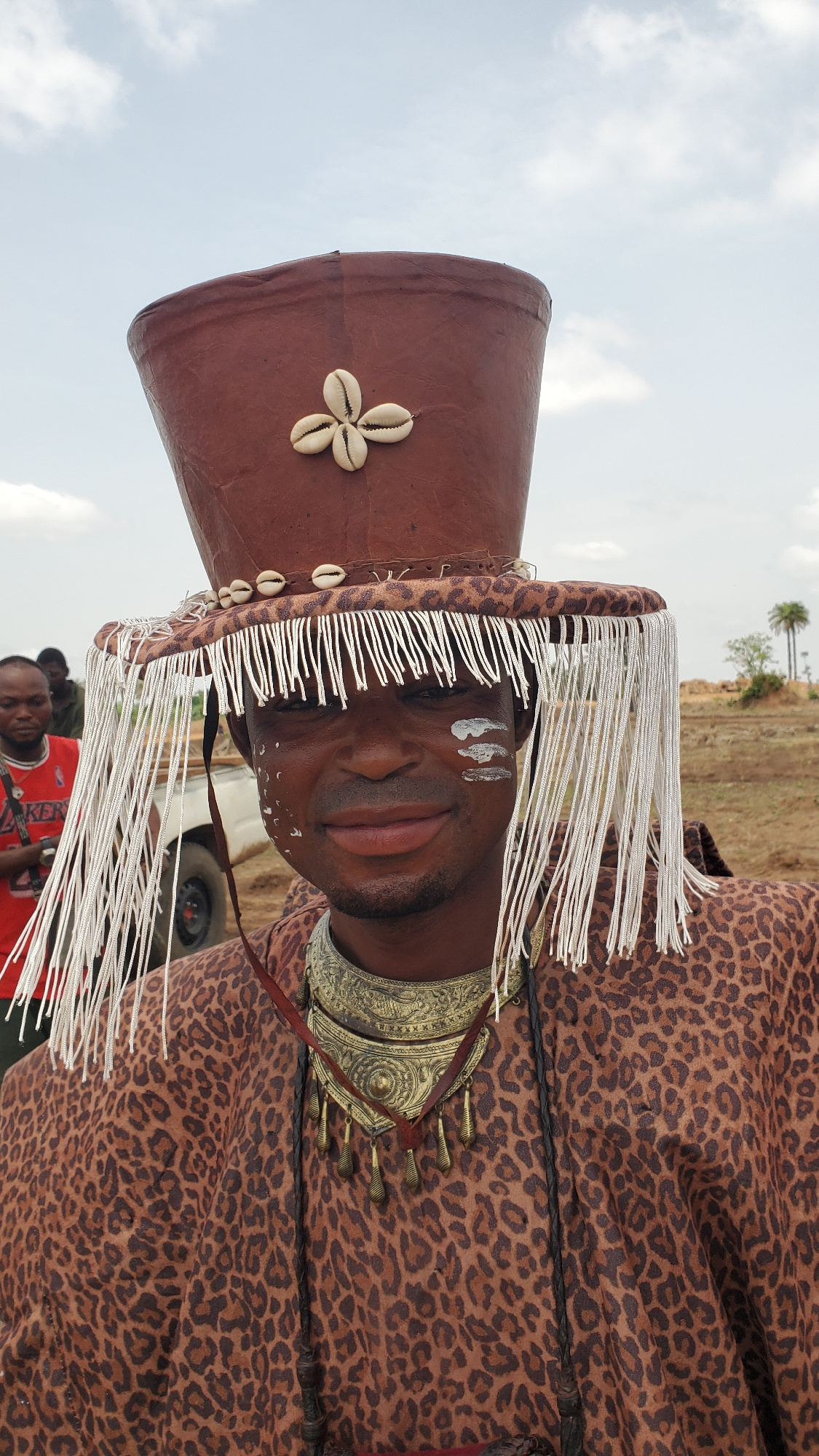 The image shows a man in traditional attire, likely in Akwanga, Nigeria. He wears a brown conical hat adorned with cowrie shells and a silver fringe. White markings are painted on his face. He also we…read more