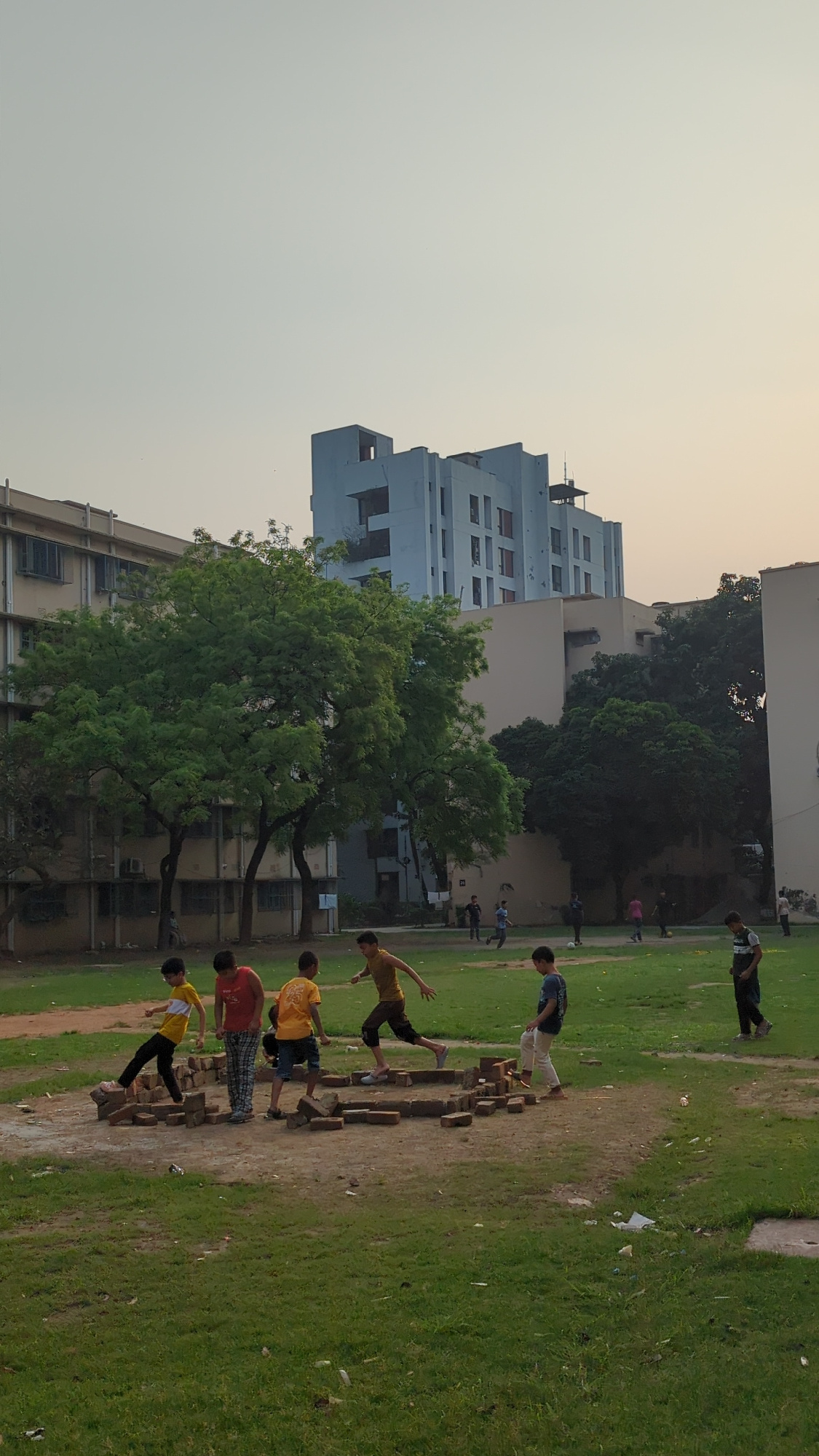 Several children are playing on an ad-hoc obstacle course created from bricks laid out on the ground in a field or park in Dhaka, Bangladesh. The area is bordered by buildings and trees. Other peopleβ¦read more
