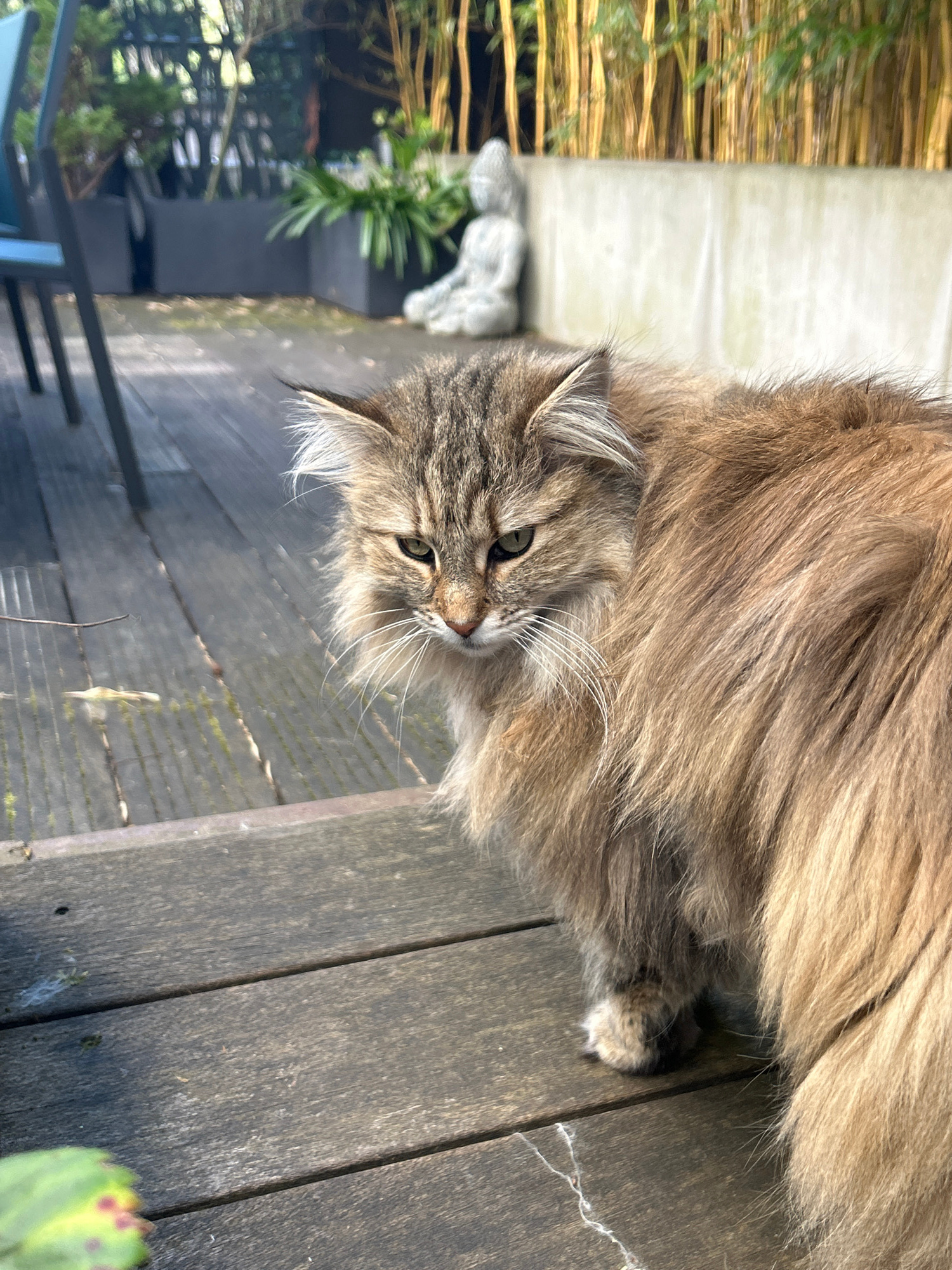 A long-haired brown tabby cat stands on a wooden deck. The cat is in the foreground, facing down and to the right, with its head tilted. Part of a building with a gray wall is visible in the backgroun…read more