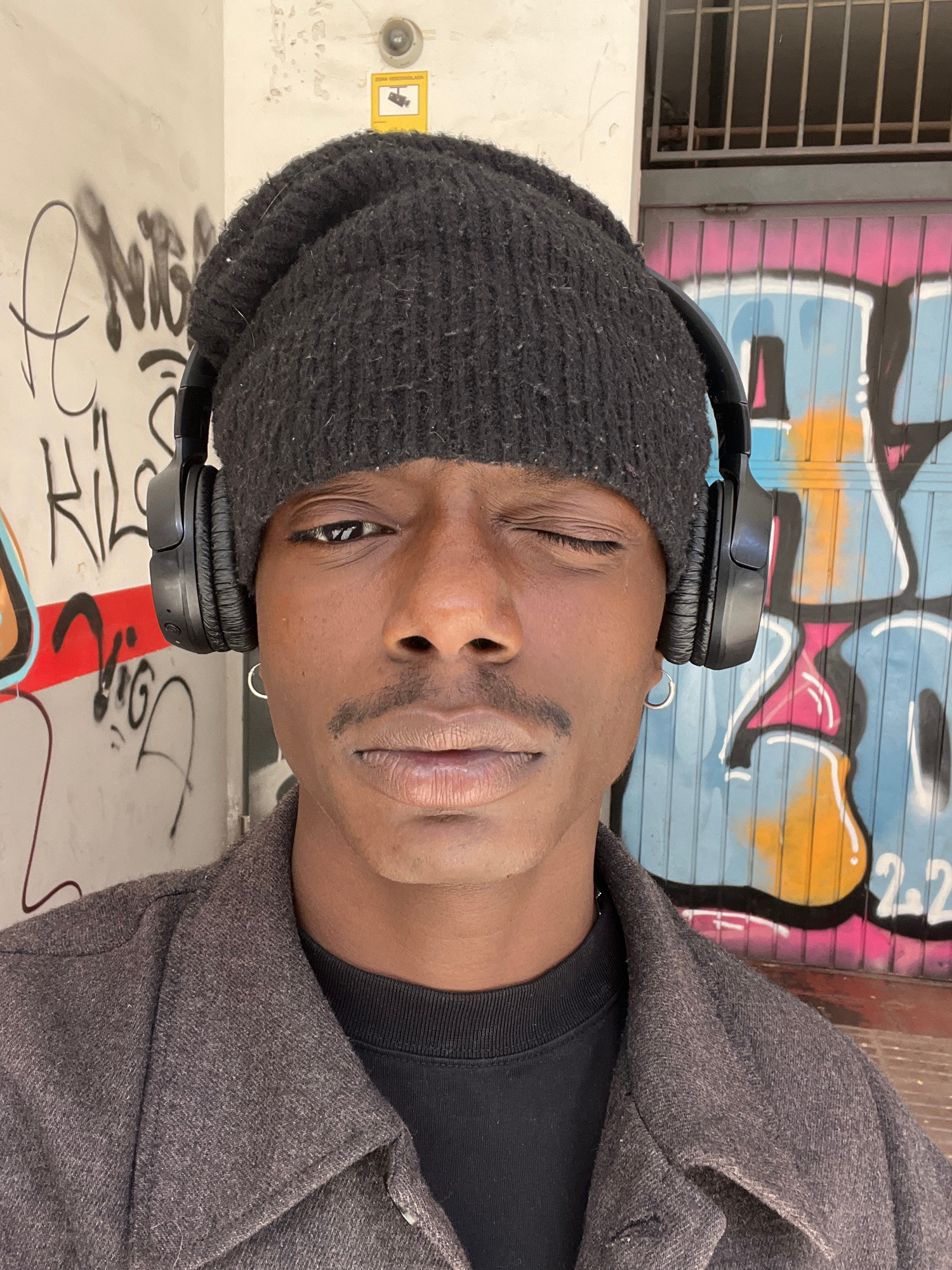 A medium shot presents a person of African descent. They are wearing a dark-colored beanie and over-ear headphones, and a gray tweed coat. The subject’s right eye is slightly closed, giving a pensive…read more