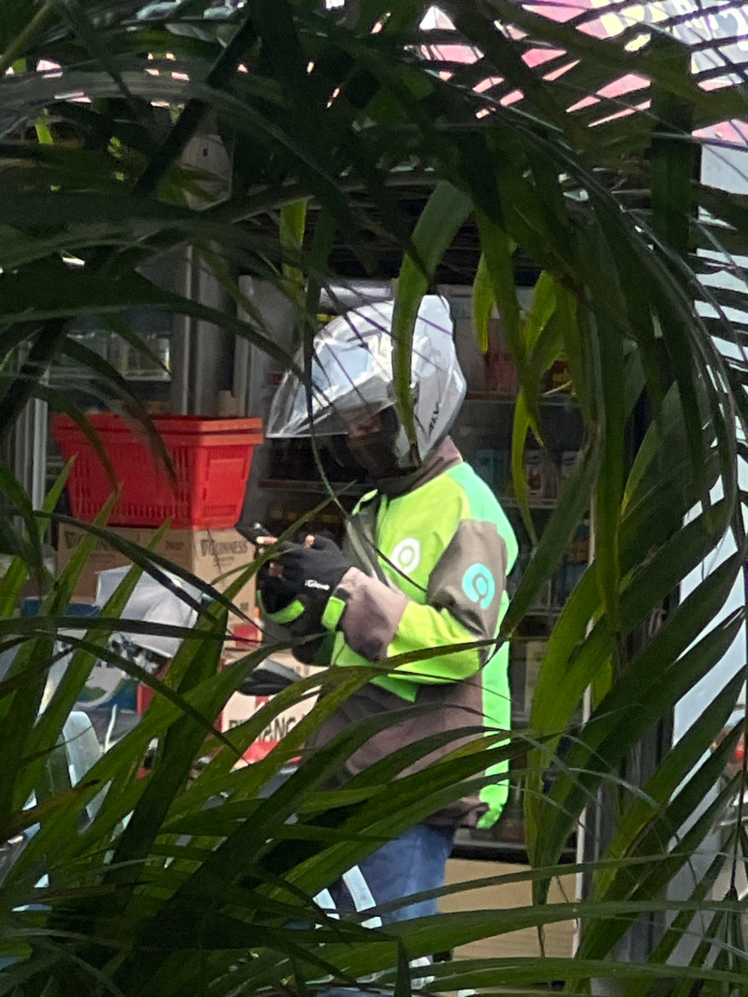 In North Kuta, Indonesia, a delivery person wearing a lime green jacket with a circular logo and a silver helmet is seen through a dense cluster of green palm-like fronds. The individual appears to be…read more