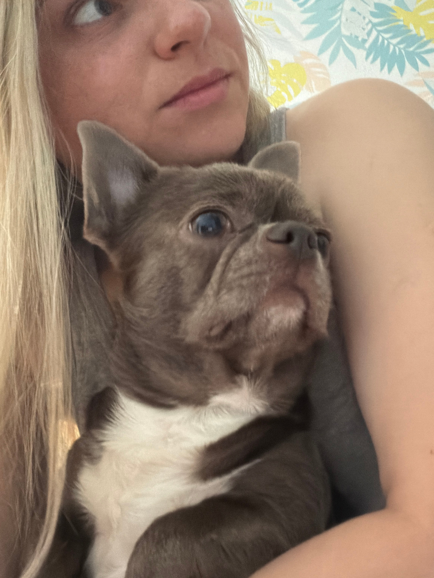 A woman with blonde hair is lying down with a grey and white bulldog-type dog resting its head on her. The background includes a pillow or blanket with a floral pattern. The setting appears to be indo…read more