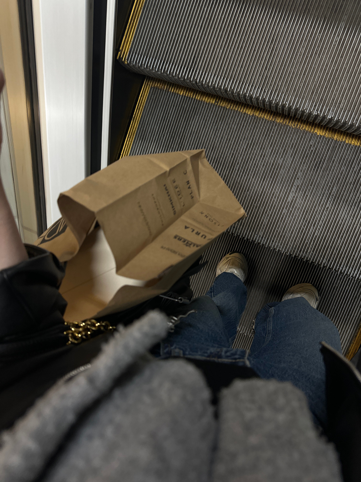 The image captures a first-person perspective looking down at a person riding an escalator in what appears to be an indoor public setting, likely a shopping mall or a metro station in Sofia, Bulgaria.…read more