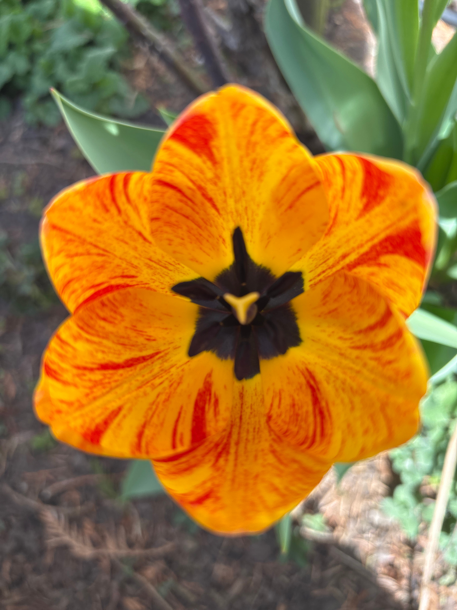 The image is a close-up shot of a tulip flower, likely taken outdoors in natural lighting. The flower is predominantly yellow with red streaks or flame-like patterns on its petals. It has a dark, possibly black, center. Green leaves are visible in the background, along with blurred patches of what appears to be ground cover or soil. It is not possible to determine if the location is in the city of Klagenfurt, Austria, with the information provided. | Open Wire