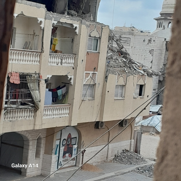An external view captures a partially destroyed multi-story residential building located in Khan Yunis, Palestinian Territory. The beige-colored structure features ornate white balustrade balconies on…read more