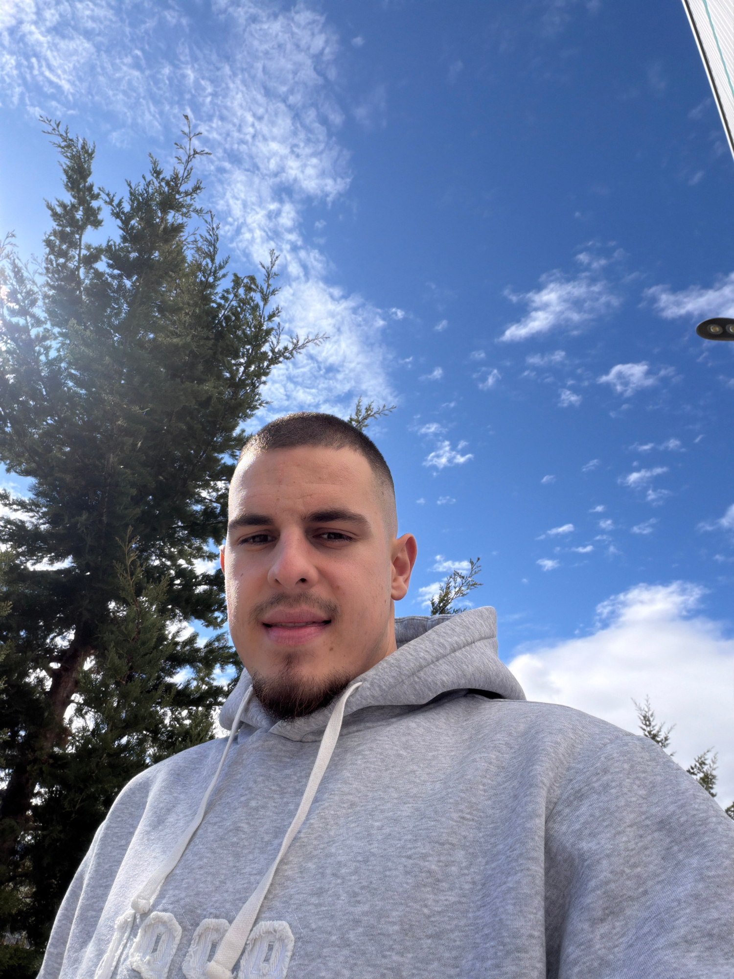 A low-angle, close-up photograph depicts a man with a short haircut, beard, and gray hooded sweatshirt. He is facing the camera with a slight smile. Behind him is a clear blue sky with scattered cloud…read more