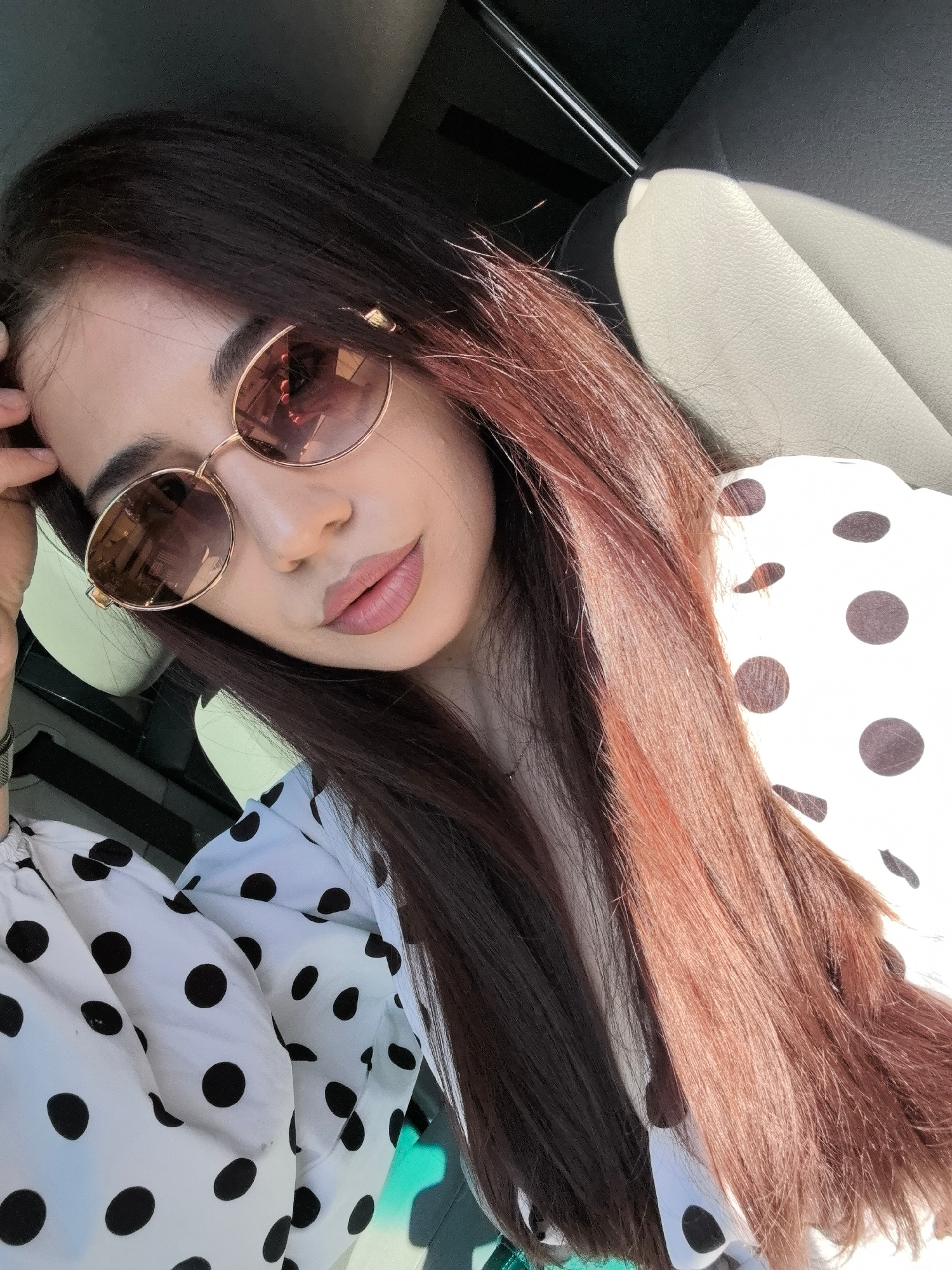 A woman wearing sunglasses and a white polka dot top is sitting inside a car. The woman has long, dark brown hair with reddish highlights. She is resting her hand on her head. The car interior has a l…read more