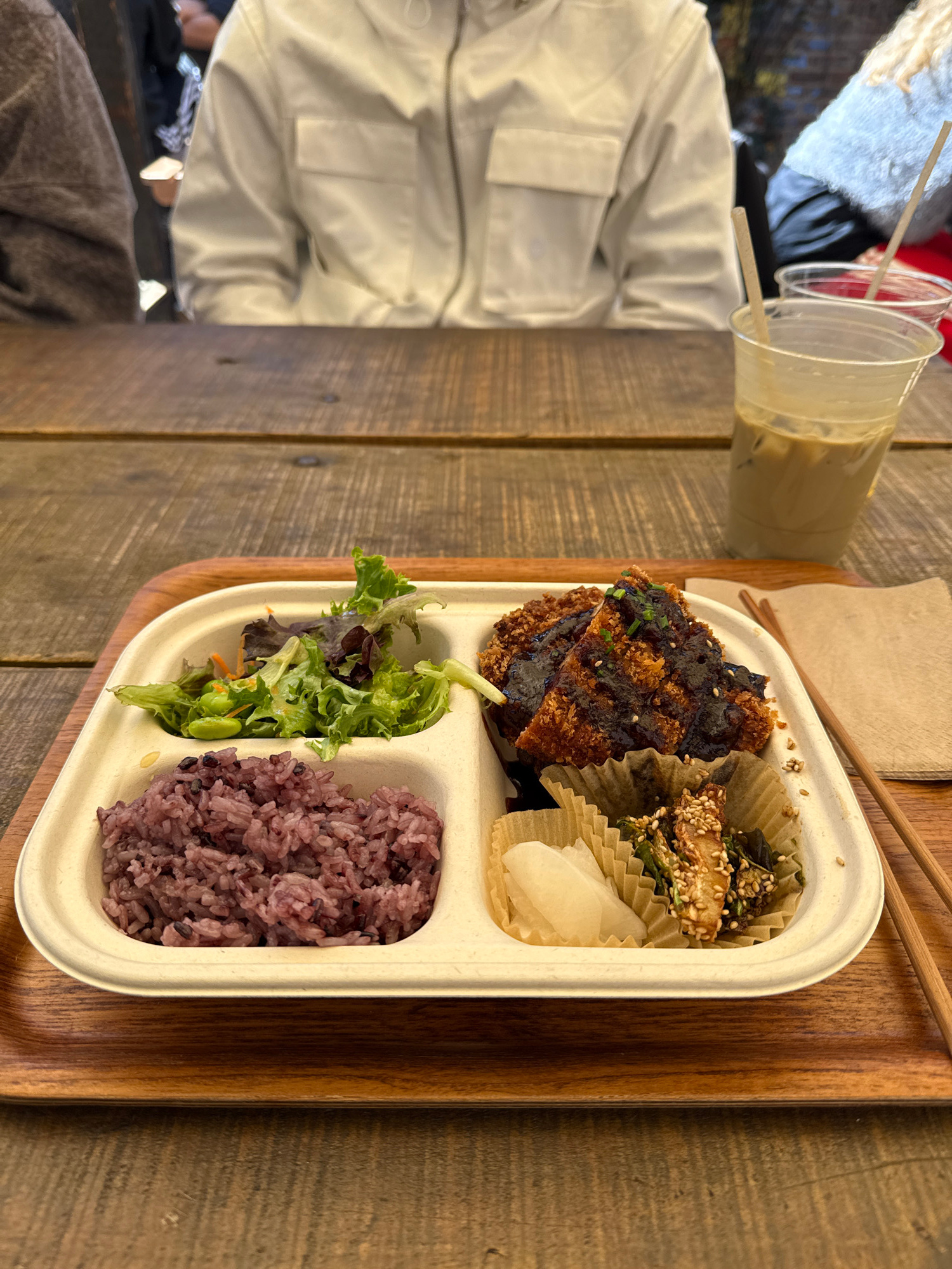 Here's a detailed description of the image: **Scene:** The image shows a meal on a wooden table. The meal is presented in a segmented, rectangular container placed on a wooden tray. **Meal Component…read more