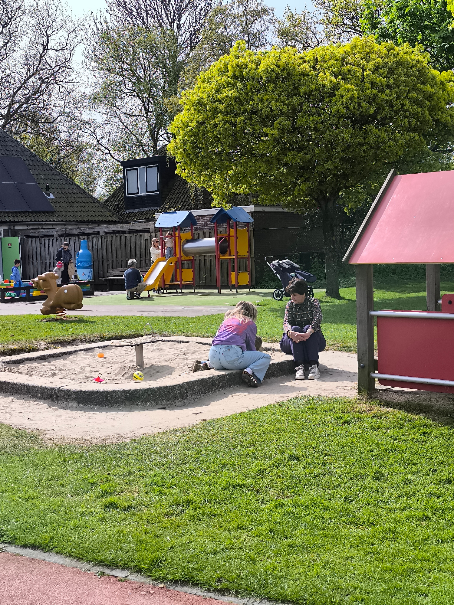 This image captures a vibrant, sunny day at an outdoor playground in Alkmaar, Netherlands. The scene is bustling with several people, including adults and children, engaged in recreational activities.…read more