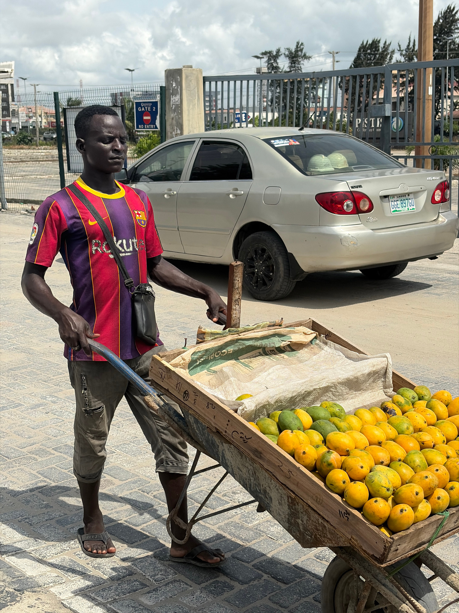A medium-angle outdoor shot, rotated 90 degrees, captures a man standing next to a cart laden with mangoes in Igboefon, Nigeria. He is dark-skinned, wearing a soccer jersey with "Rakuten" printed on i…read more
