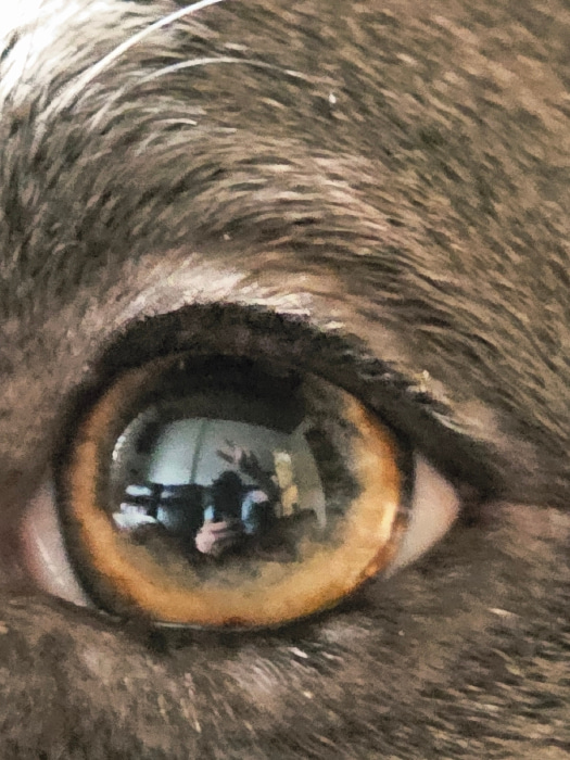 A close-up, high-resolution image captures the left eye of a domestic animal, likely a dog, framed by its greyish-brown fur. The animal's fur appears dense, with individual lighter hairs visible, part…read more