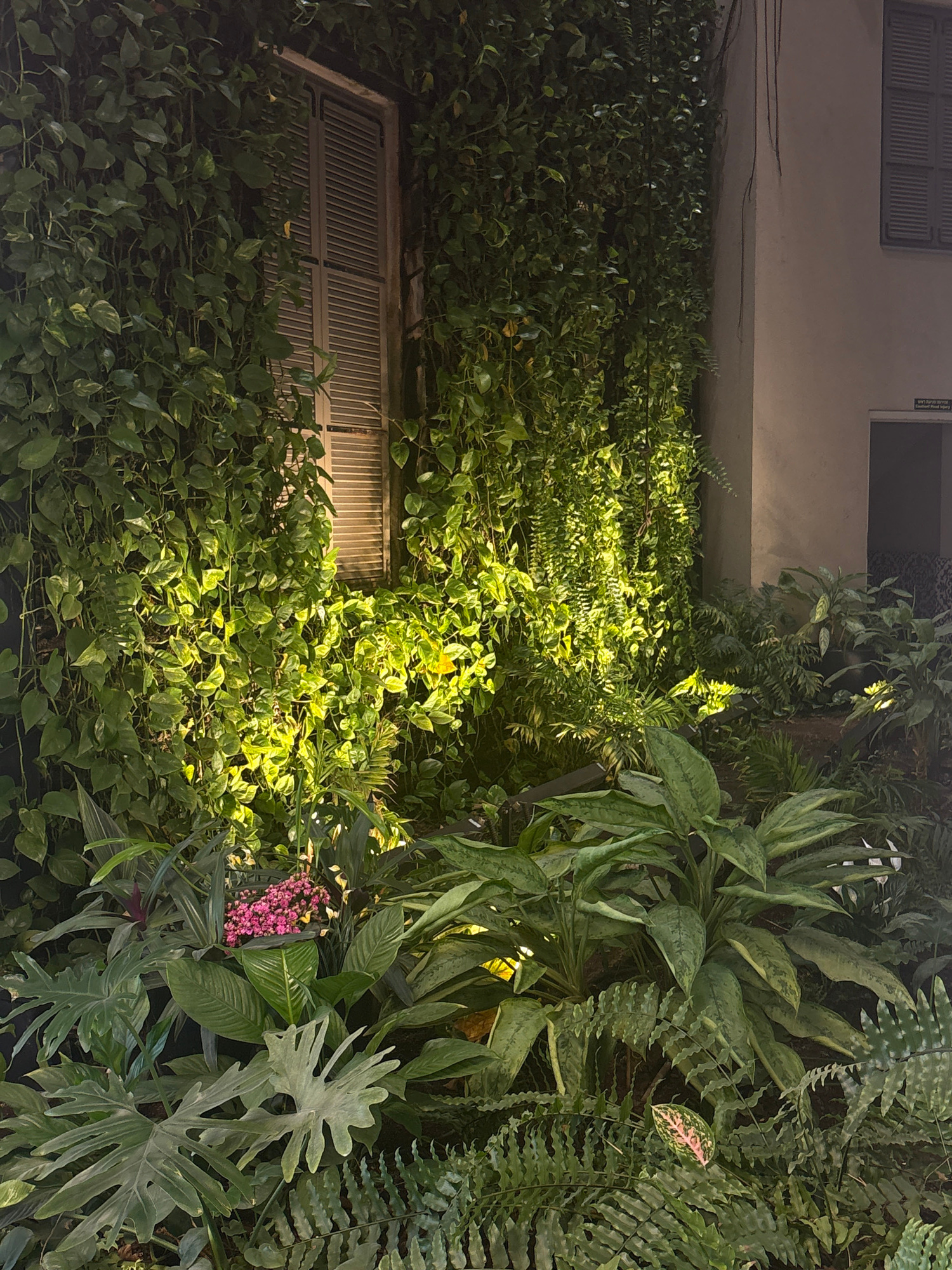 This image depicts a meticulously cultivated vertical garden and plant display on a building exterior, located in Tel-Aviv, Israel. The scene is dominated by a wall extensively covered in dense, varie…read more