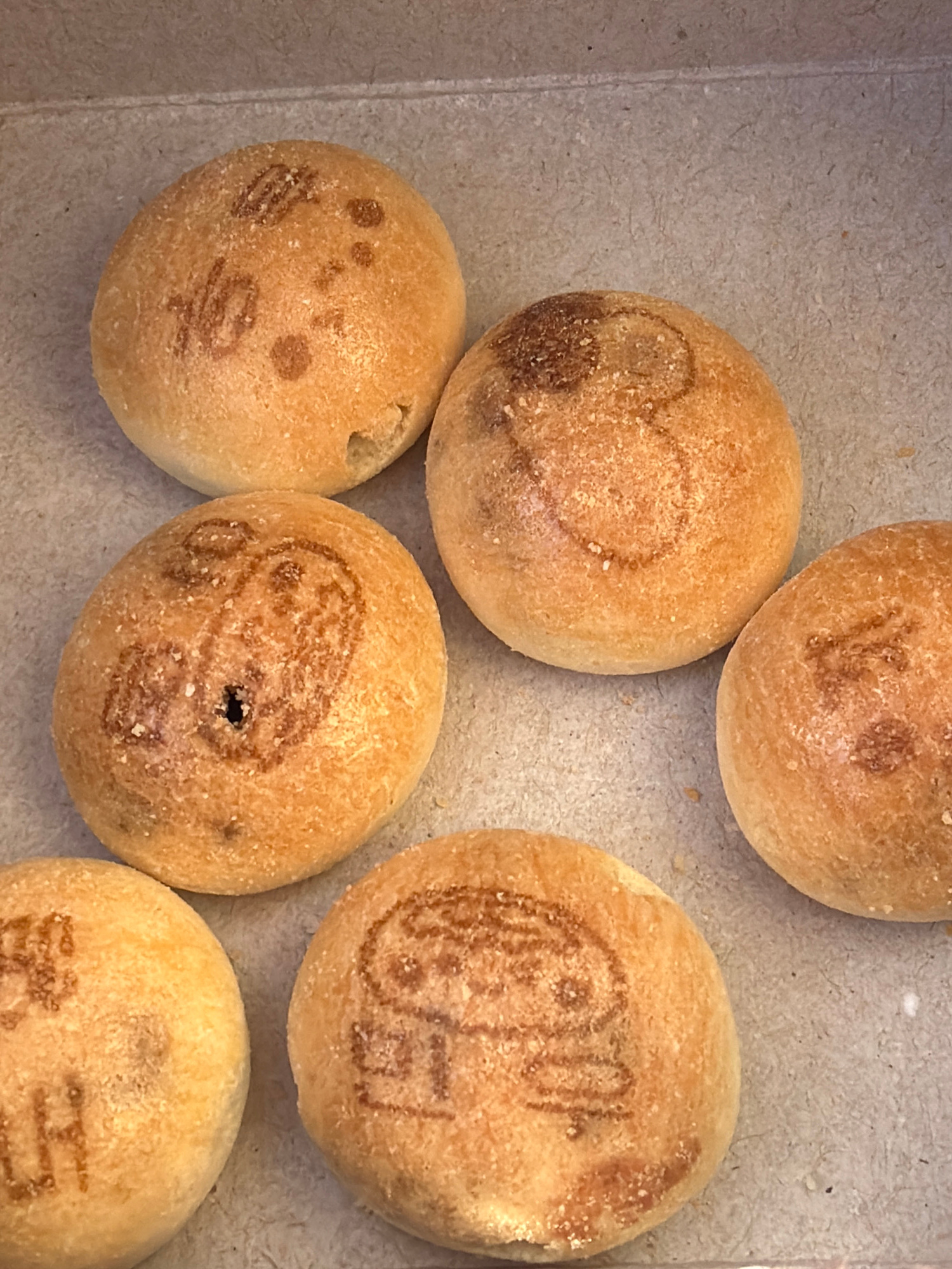 The image displays six roughly spherical, golden-brown baked items, likely buns or small loaves, arranged on a flat, light brown, textured surface consistent with recycled paperboard, possibly inside…read more