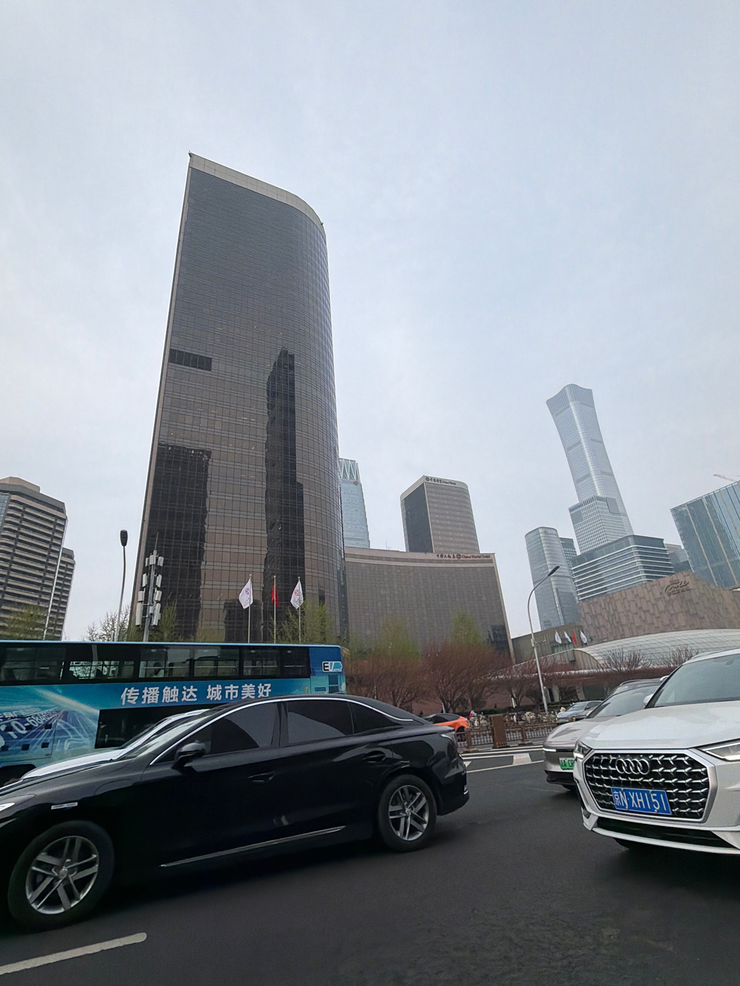 The image captures a street scene in the Chaoyang District of Beijing, China, characterized by modern architecture and vehicular traffic. Prominent skyscrapers dominate the skyline, including the CCTV…read more