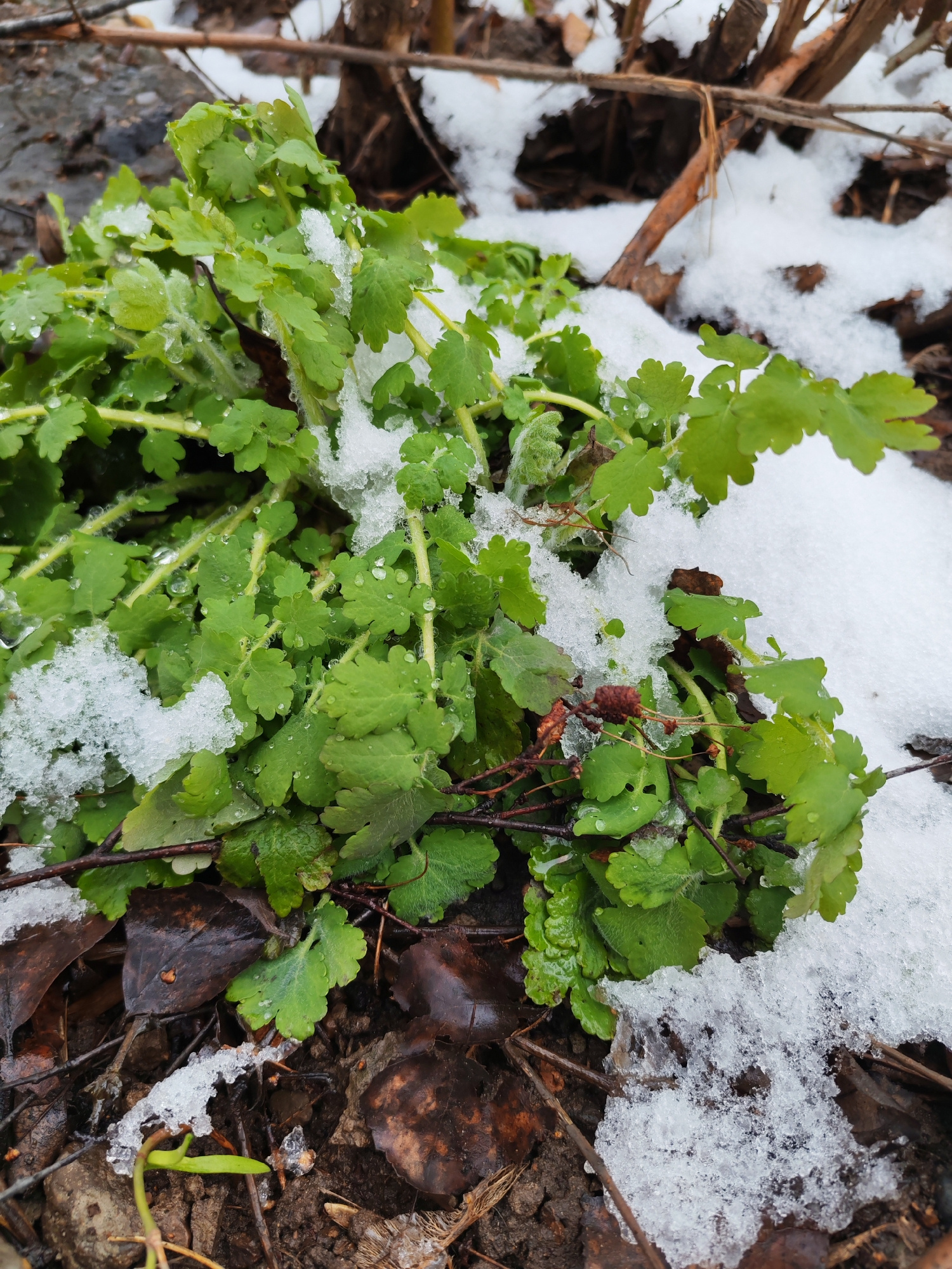 The image shows a patch of ground cover vegetation with snow on and around it. The vegetation has round, scalloped leaves and green stems. Patches of snow are present both on top of and beside the gre…read more