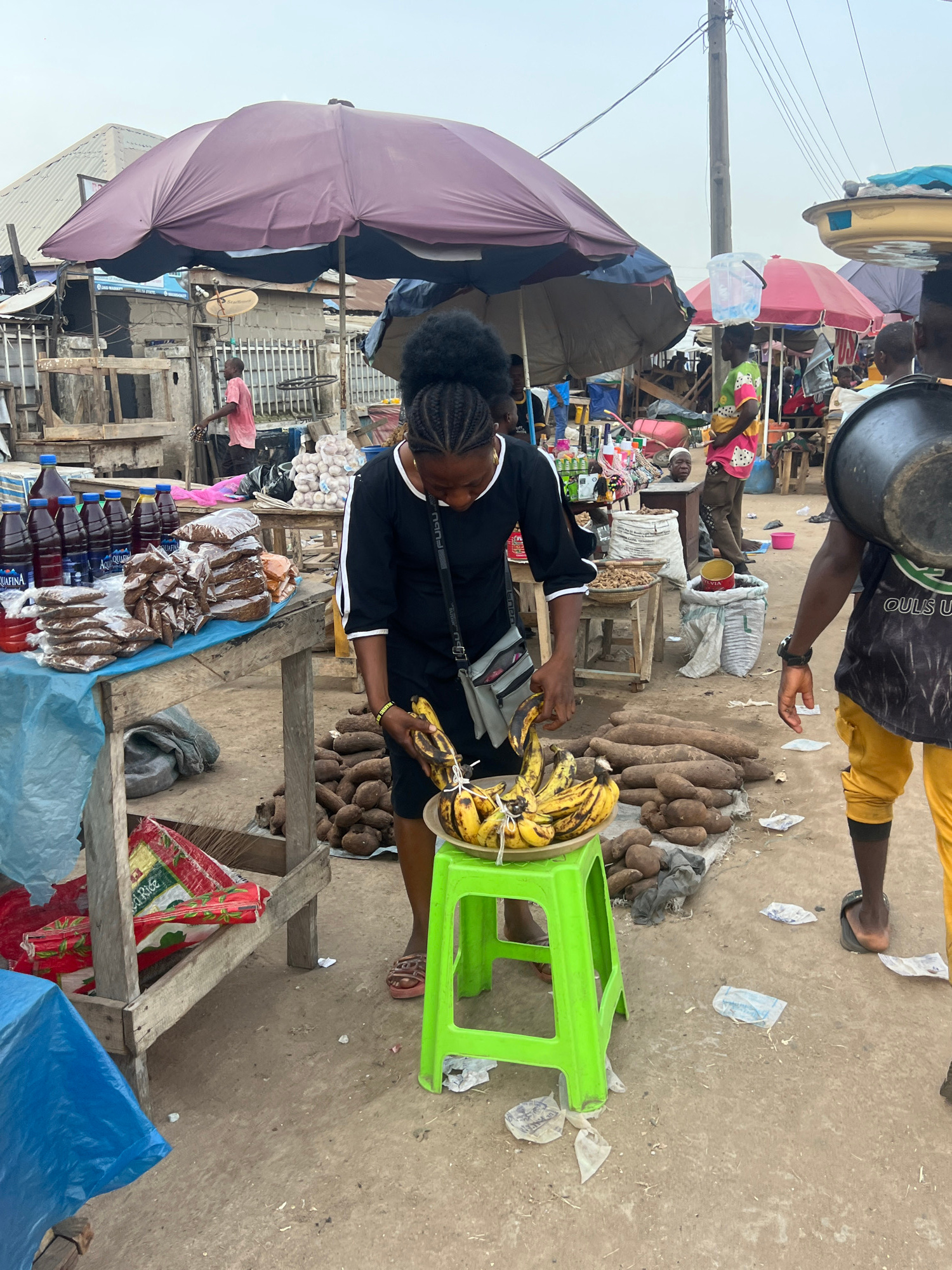 In a busy market setting in Oko Amakom, Nigeria, a young woman in a black dress with white trim stands holding a bunch of bananas. The bananas are in a metal tray on a green plastic stool. To her righ…read more