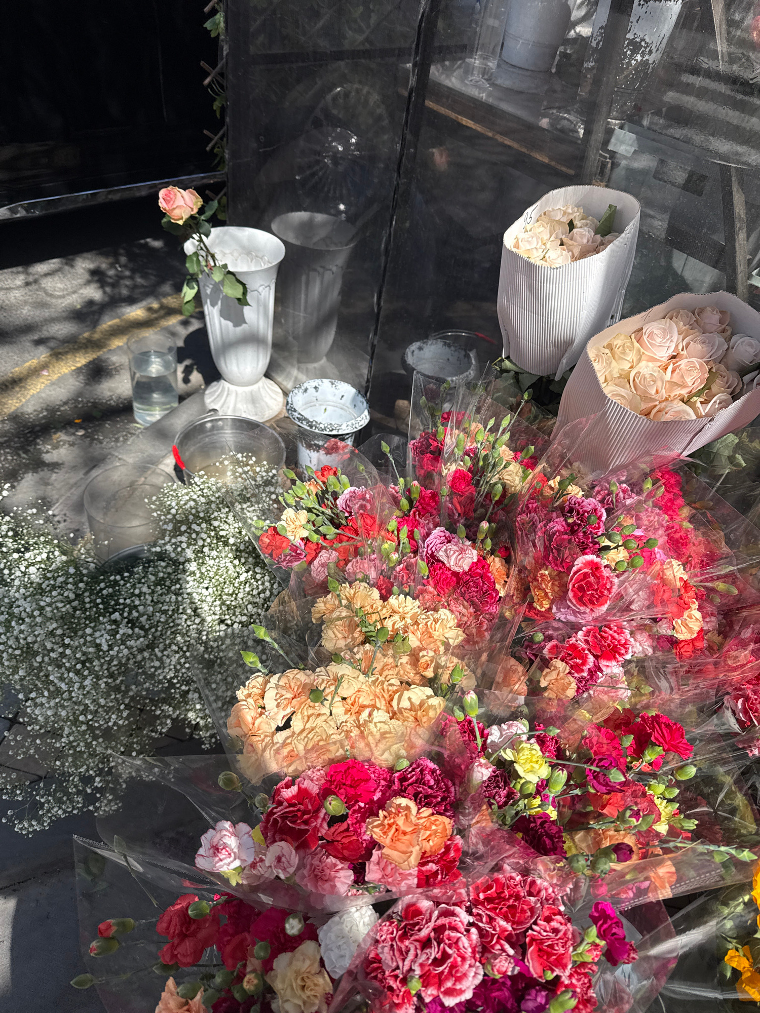 This overhead shot captures a vibrant display of fresh flowers, likely at a market stall or florist shop in Yerevan, Armenia. The flowers are arranged on a highly reflective, dark surface, possibly gl…read more