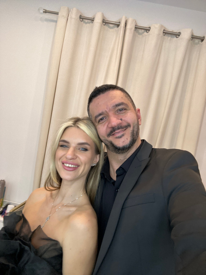 A man and a woman pose for a photo. The man wears a dark suit, while the woman wears a strapless dress with a silver necklace. Both are smiling. Cream-colored curtains with silver grommets are in the…read more