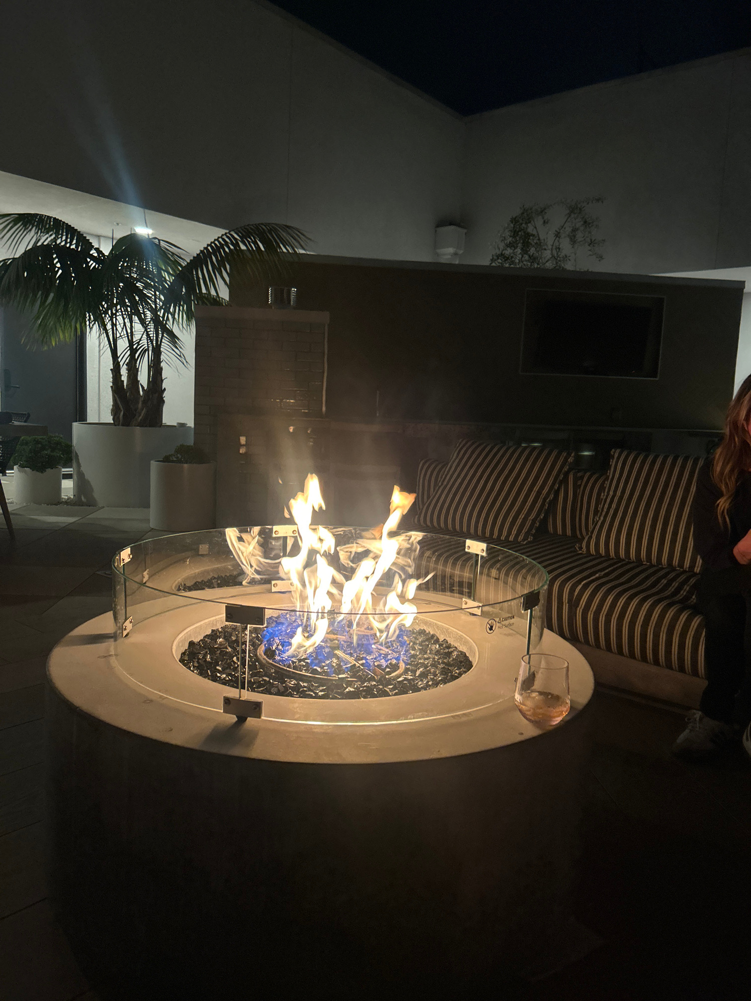 The image displays an upscale outdoor patio or rooftop terrace at night, located in a modern building in Los Angeles, California, United States of America. In the foreground, a circular, light-colore…read more