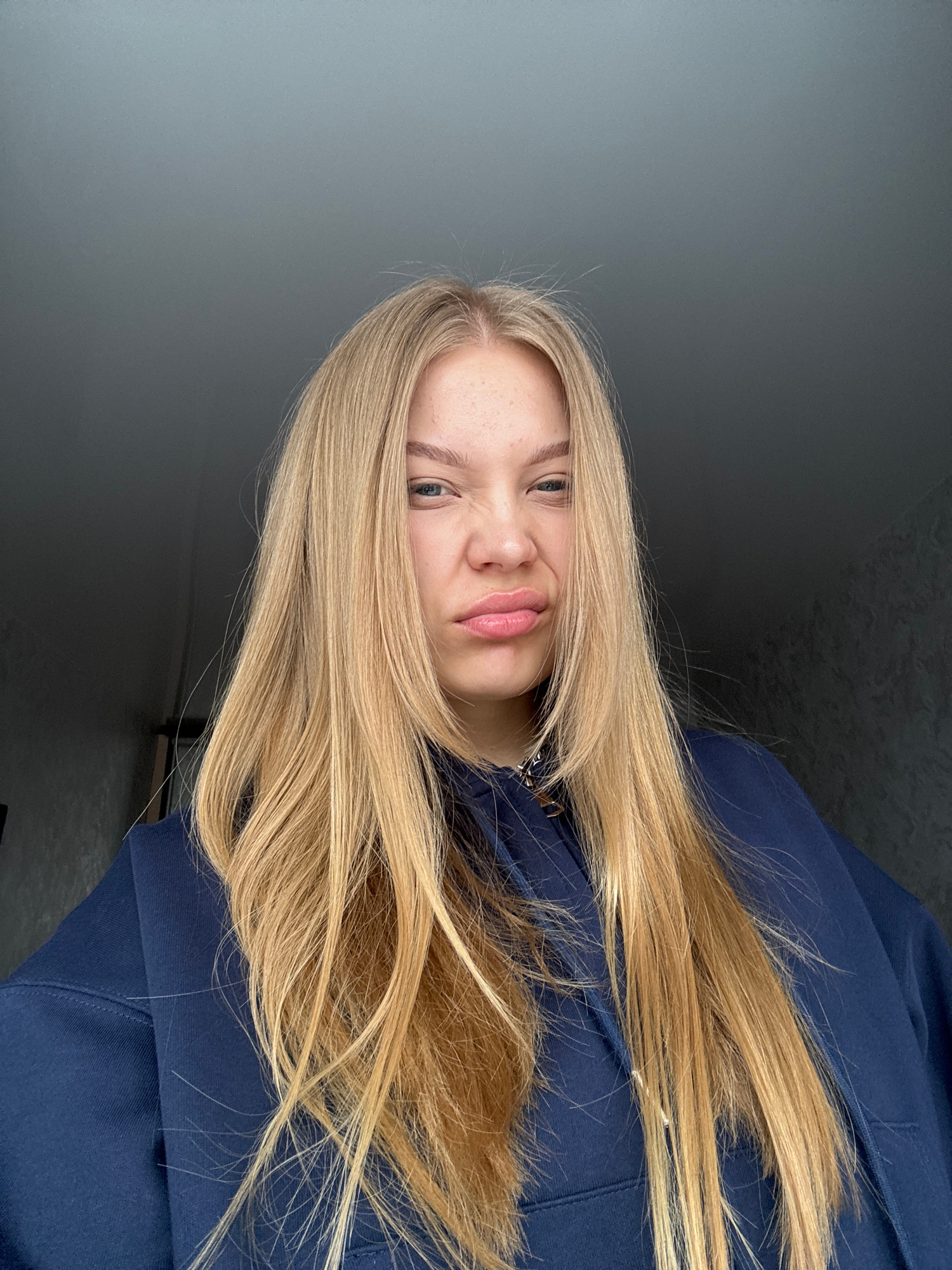 A blonde-haired woman wearing a blue hoodie poses for a selfie. She is indoors, in front of a gray wall. No information confirms the location is in Chaikovsky, Russia.
