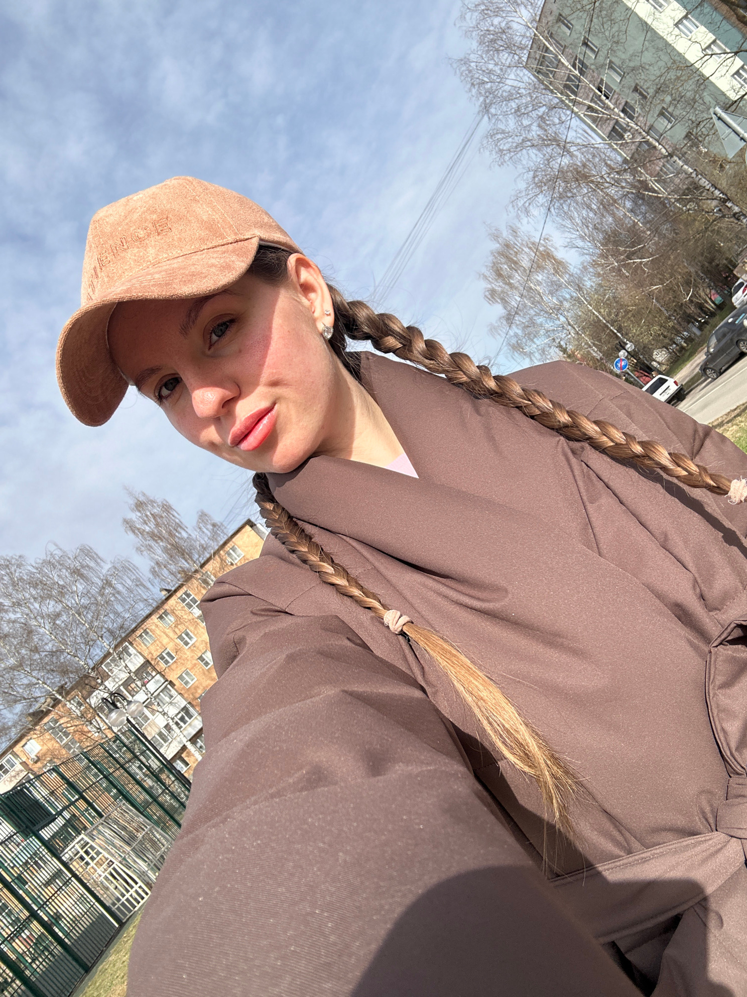 A woman wearing a light brown cap and a brown jacket is pictured in an outdoor selfie-style shot. Her hair is styled in two braids. The setting appears to be urban, with buildings and trees visible in…read more