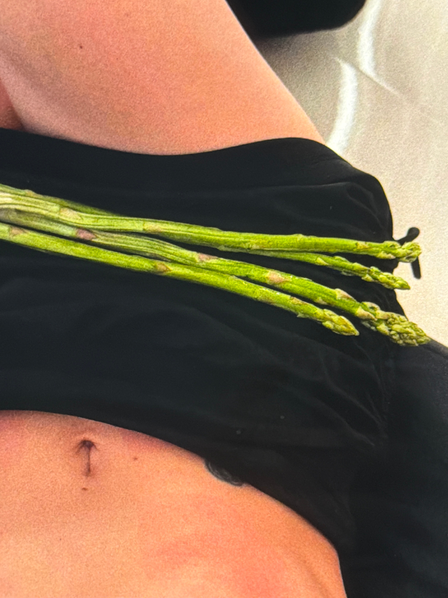 A close-up shot reveals a person's lap with a bunch of asparagus resting on a black garment. The person's skin tone appears fair, and there is a possible scar visible on their skin. The background is…read more