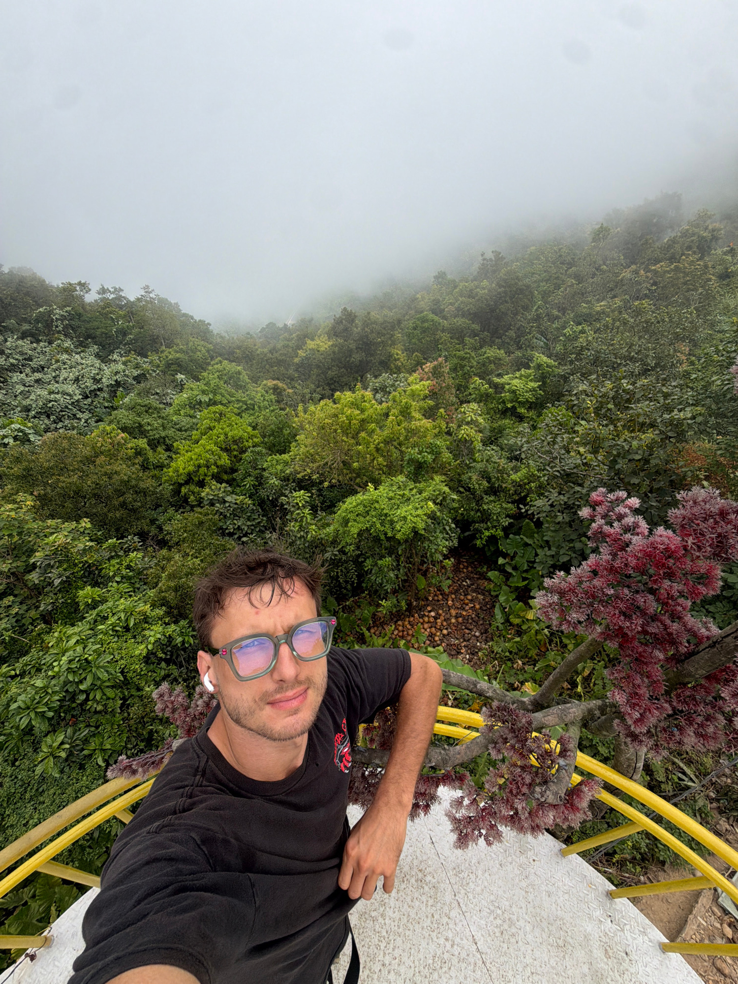 A man takes a selfie from a high vantage point. The man is light-skinned, has short brown hair, and wears blue-tinted glasses, a black T-shirt, and an in-ear wireless earbud. He is positioned on a whi…read more