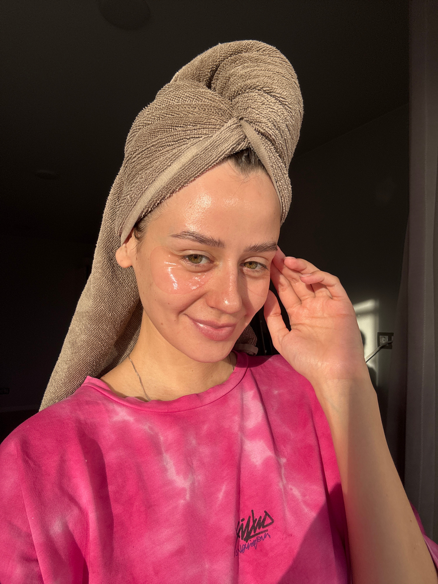 A person is photographed indoors with a beige towel wrapped around their head. Two clear gel patches are placed under their eyes. The person is wearing a bright pink, tie-dye shirt. The background is…read more