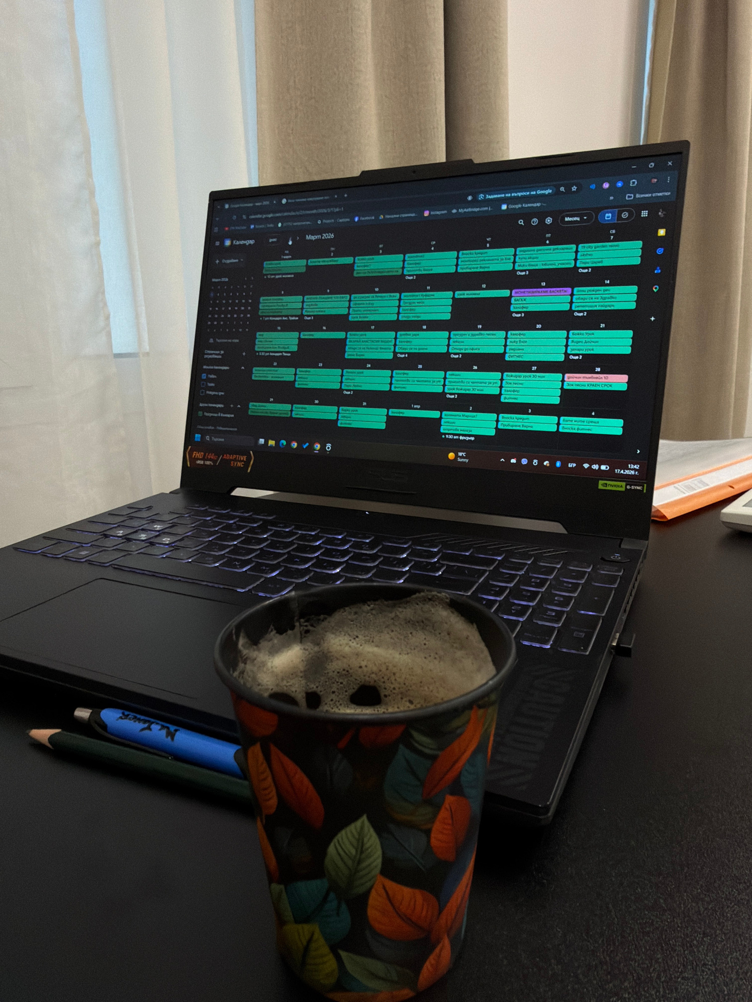 An overhead, slightly angled shot captures a laptop, a mug, and writing implements on a dark desk surface, indicating a workspace. The image is taken from a perspective that looks down onto the setup,…read more