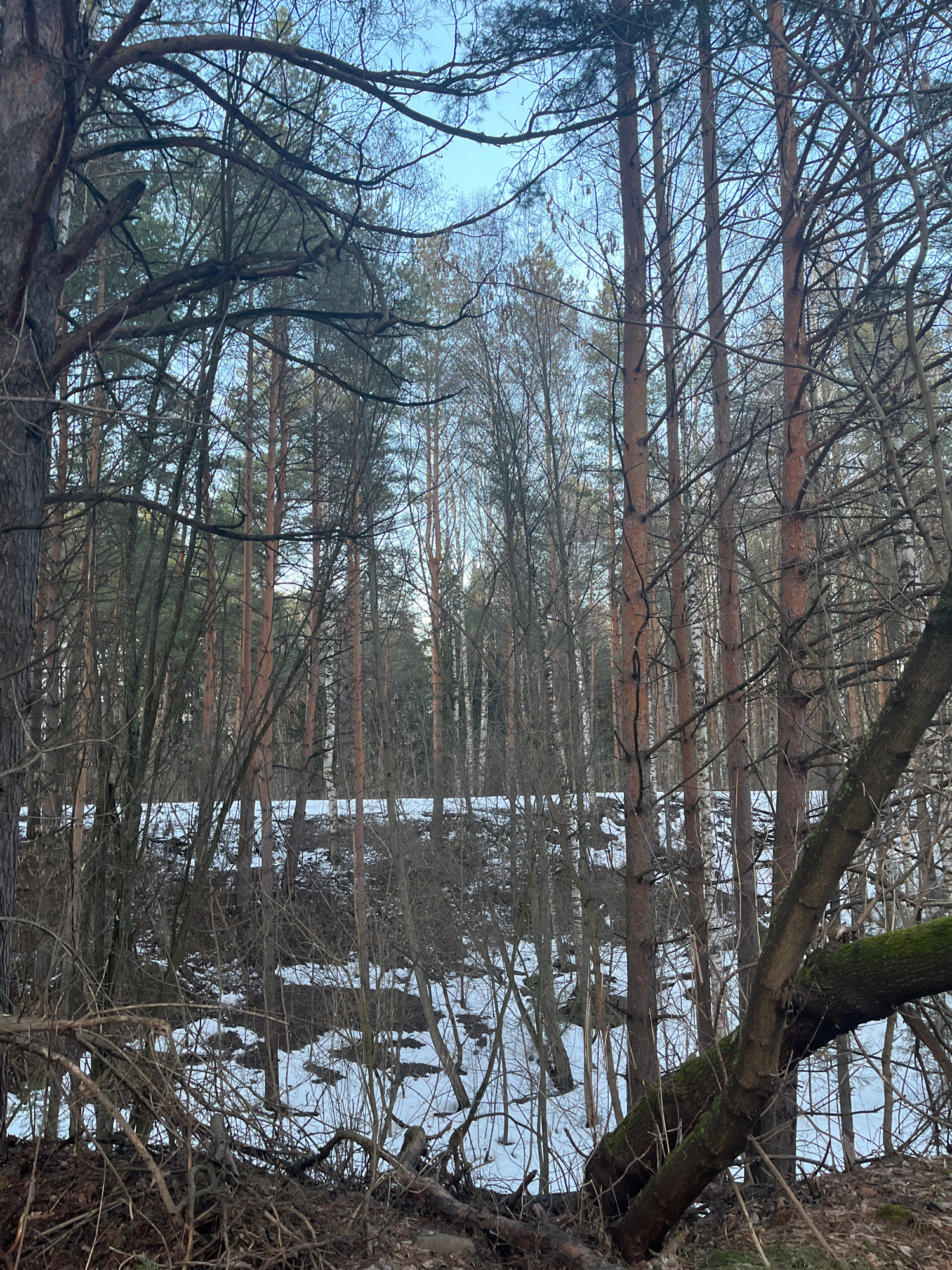 The image shows a forest scene in what may be the city of Chaikovsky, Russia, as requested. The viewpoint is looking up through the bare branches of deciduous trees and the trunks of coniferous trees.…read more