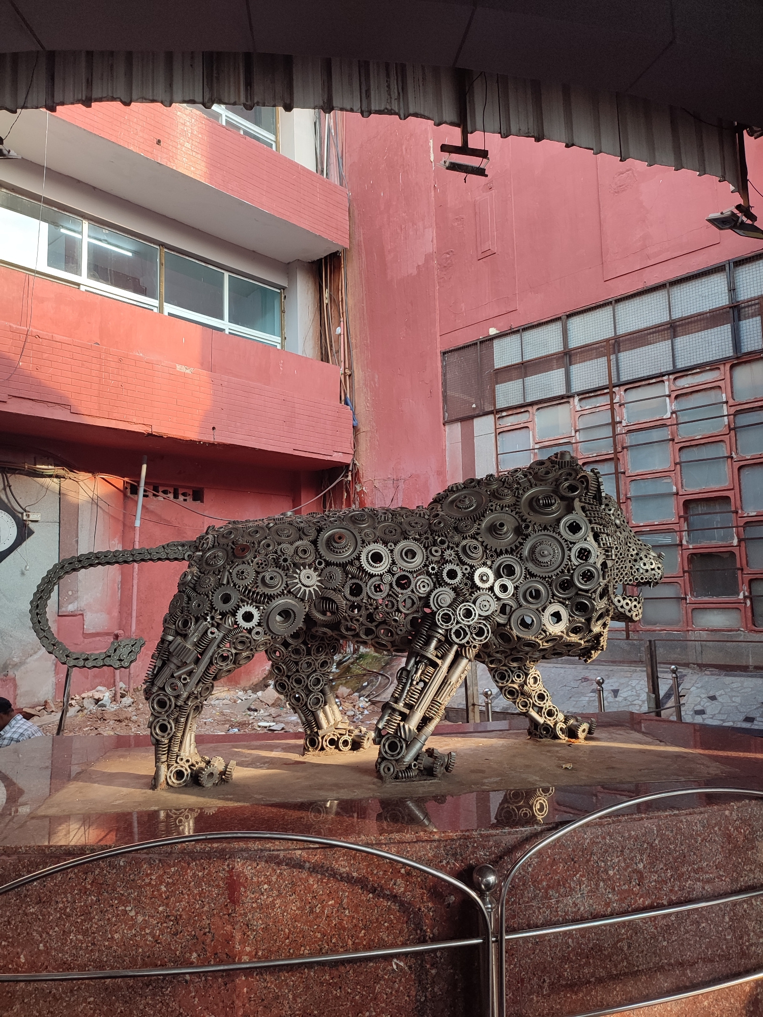 Here's a detailed description of the image: The image shows a metal sculpture of a lion, constructed from gears, cogs, and other mechanical components. The sculpture is positioned on a red marble-lik…read more