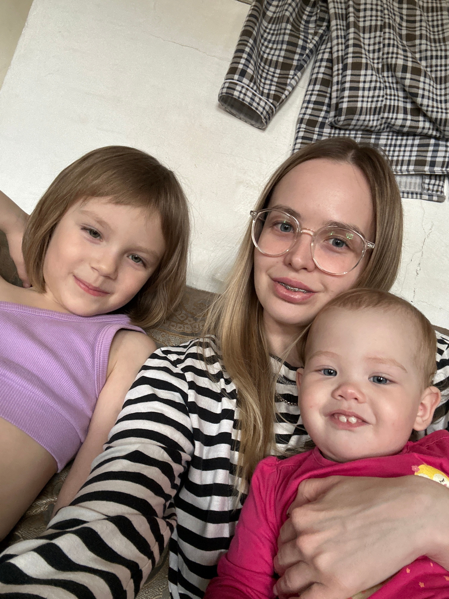 The image shows a selfie-style view of a woman with two children. The woman is wearing glasses and braces, with long blonde hair. A toddler in a pink shirt is held close to her face, smiling. A young…read more