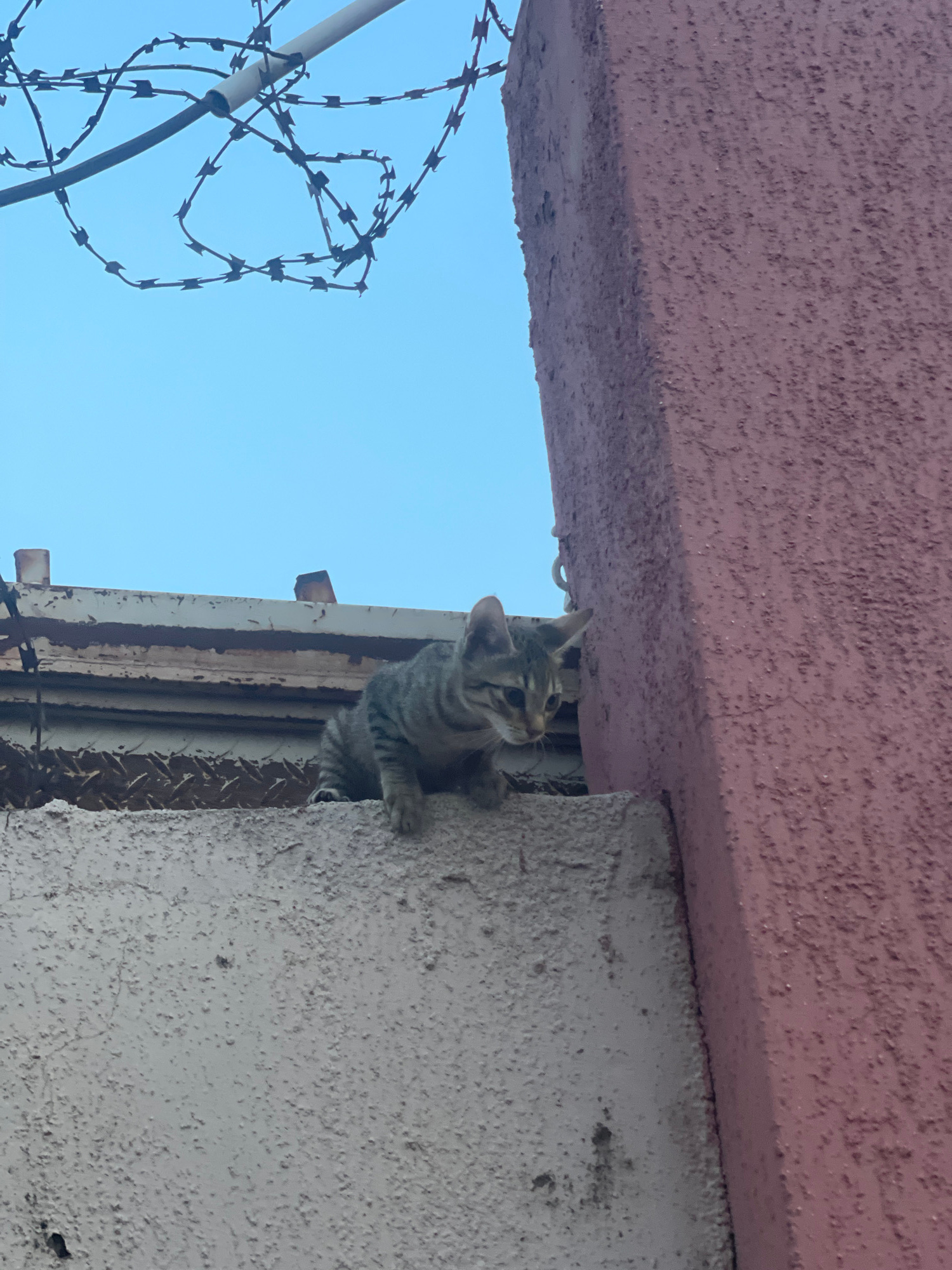 A gray tabby kitten is clinging to the edge of a concrete structure. The structure is topped by a pink, textured overhang. Barbed wire is visible in the lower left corner of the frame, set against a c…read more