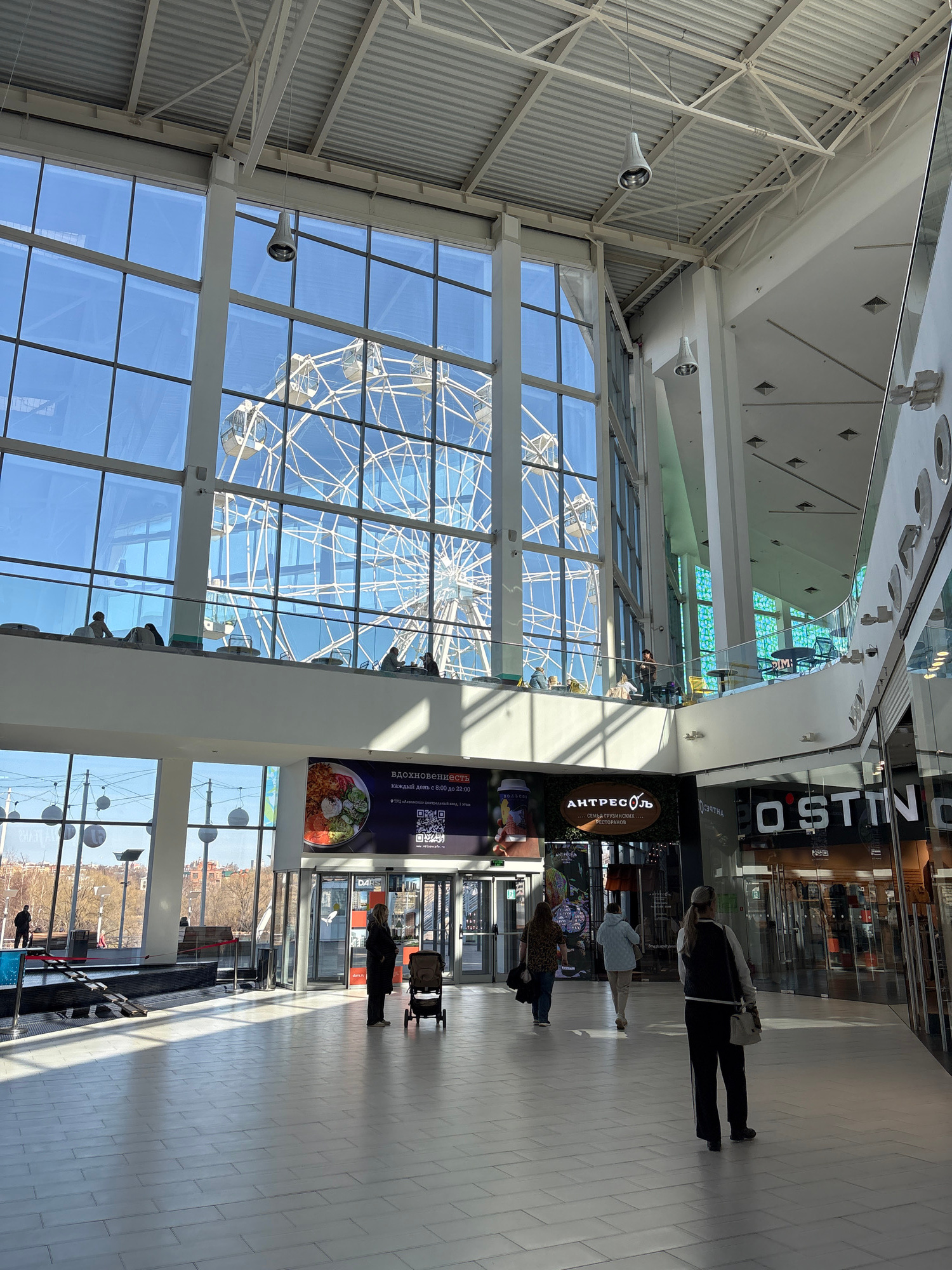 The image captures an interior view of a shopping mall in Ulyanovsk, Russia, distinguished by a large, expansive glass facade displaying a Ferris wheel in the distance. The mall's interior is bathed i…read more