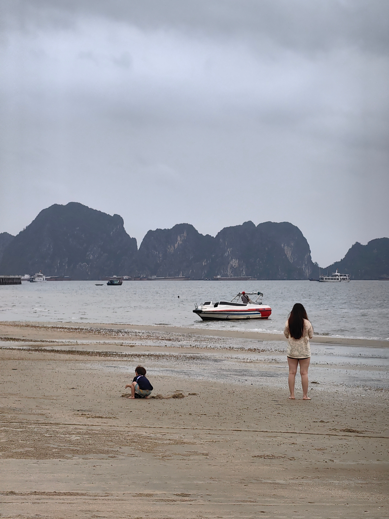 This full-frame, eye-level photograph captures a serene, overcast day on a beach in Bai Chay Ward, Vietnam, showcasing the iconic karst limestone islands of the Ha Long Bay region in the background.…read more