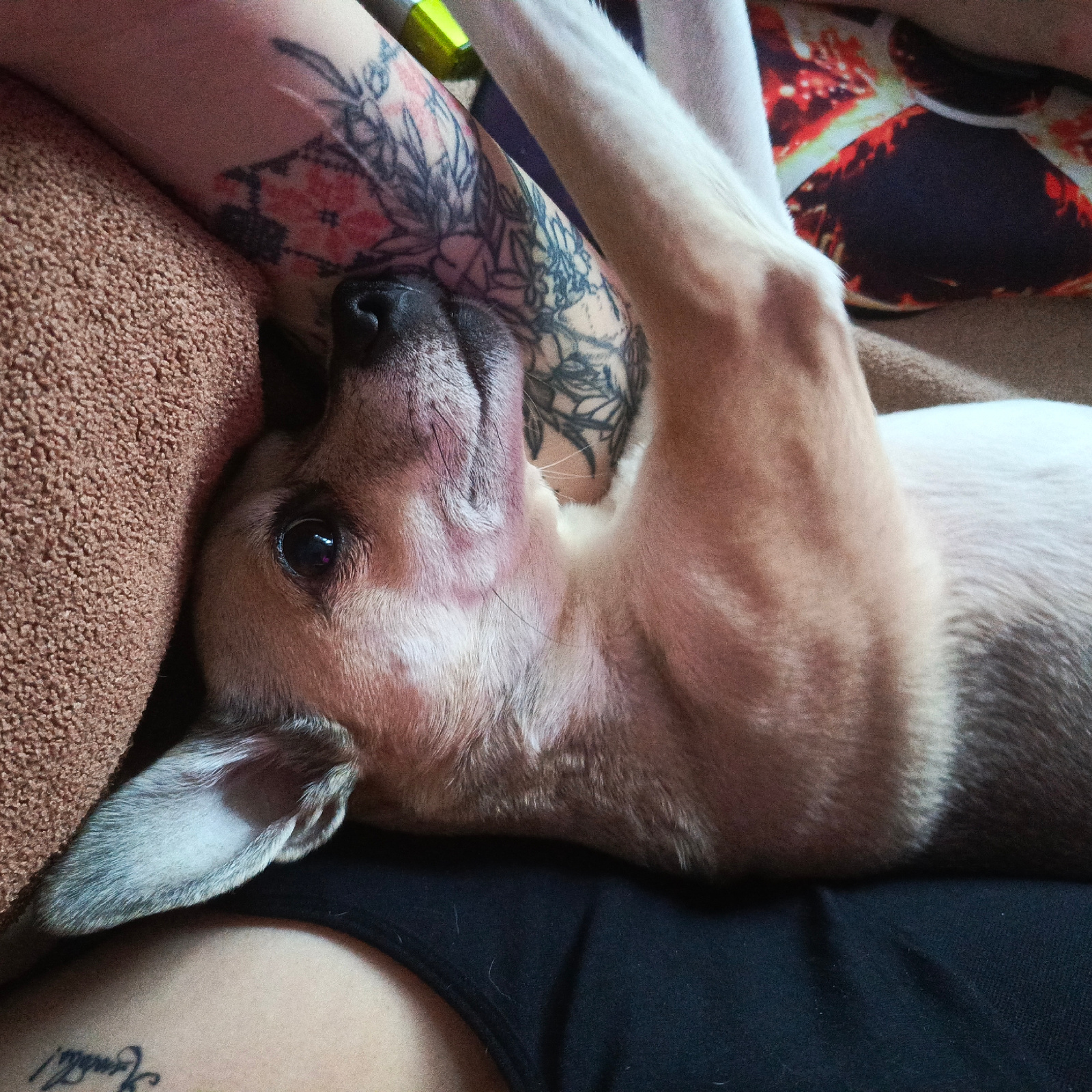 The image displays a small, light-brown and white canine animal, likely a dog, resting on what appears to be a human lap or chest. The dog is positioned on its back, head turned to the viewer's left,…read more