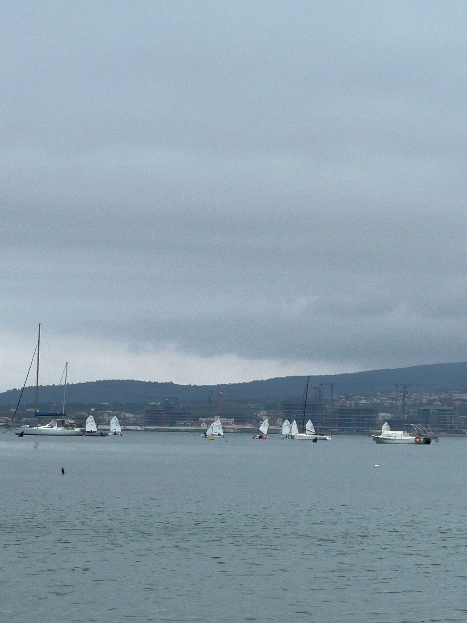 The image depicts a body of water with several boats, possibly sailboats, lined along the shore. In the background, there's a landmass with buildings and vegetation, suggesting a coastal urban area. I…read more
