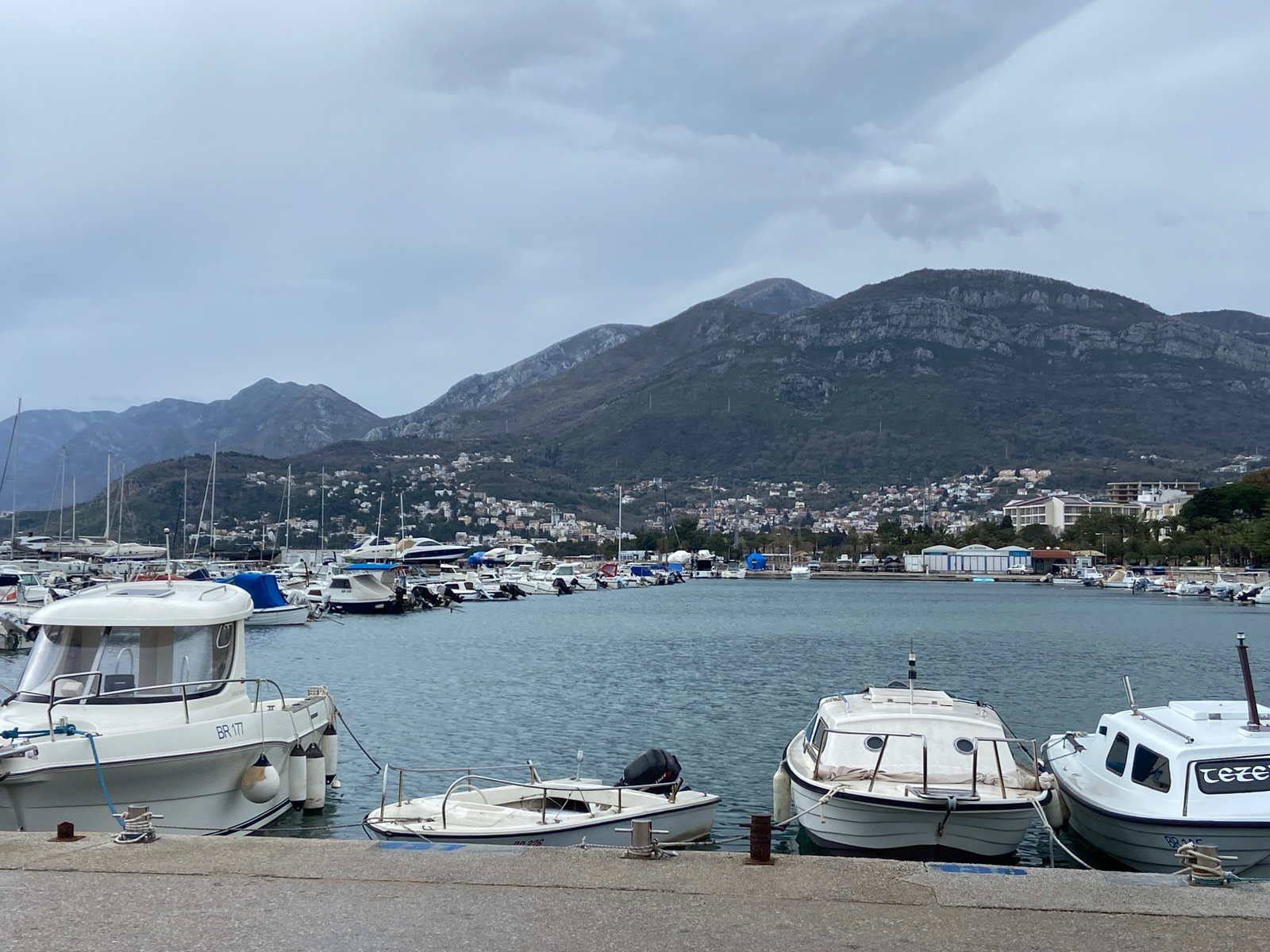 The image shows a marina in Bar, Montenegro on an overcast day. In the foreground are several white boats docked along a concrete pier. The boat on the left has "BR 171" printed on its side. To the ri…read more