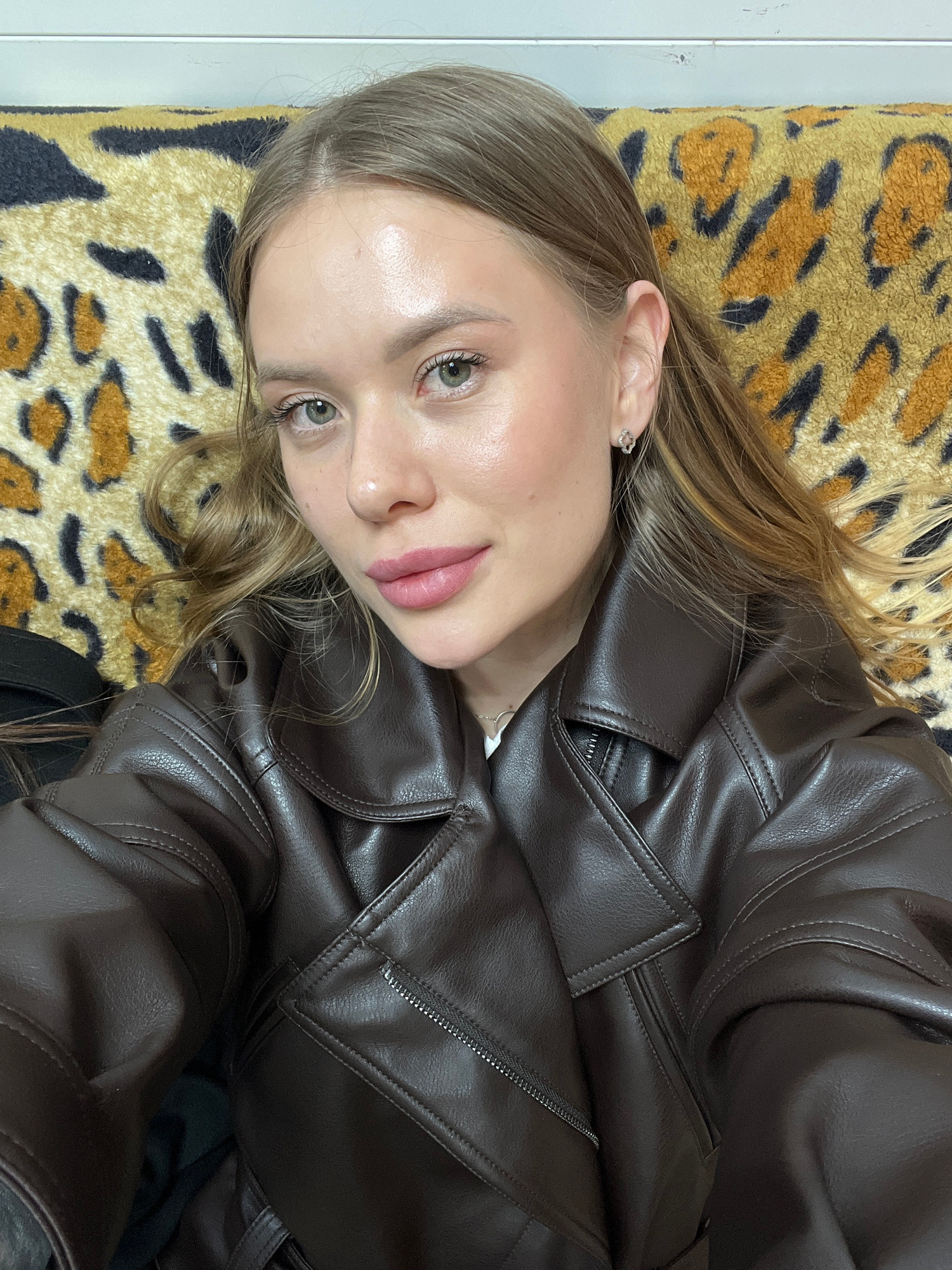 A young woman lies on a leopard-print textile, wearing a brown leather jacket. The location is unknown and cannot be determined from this image.