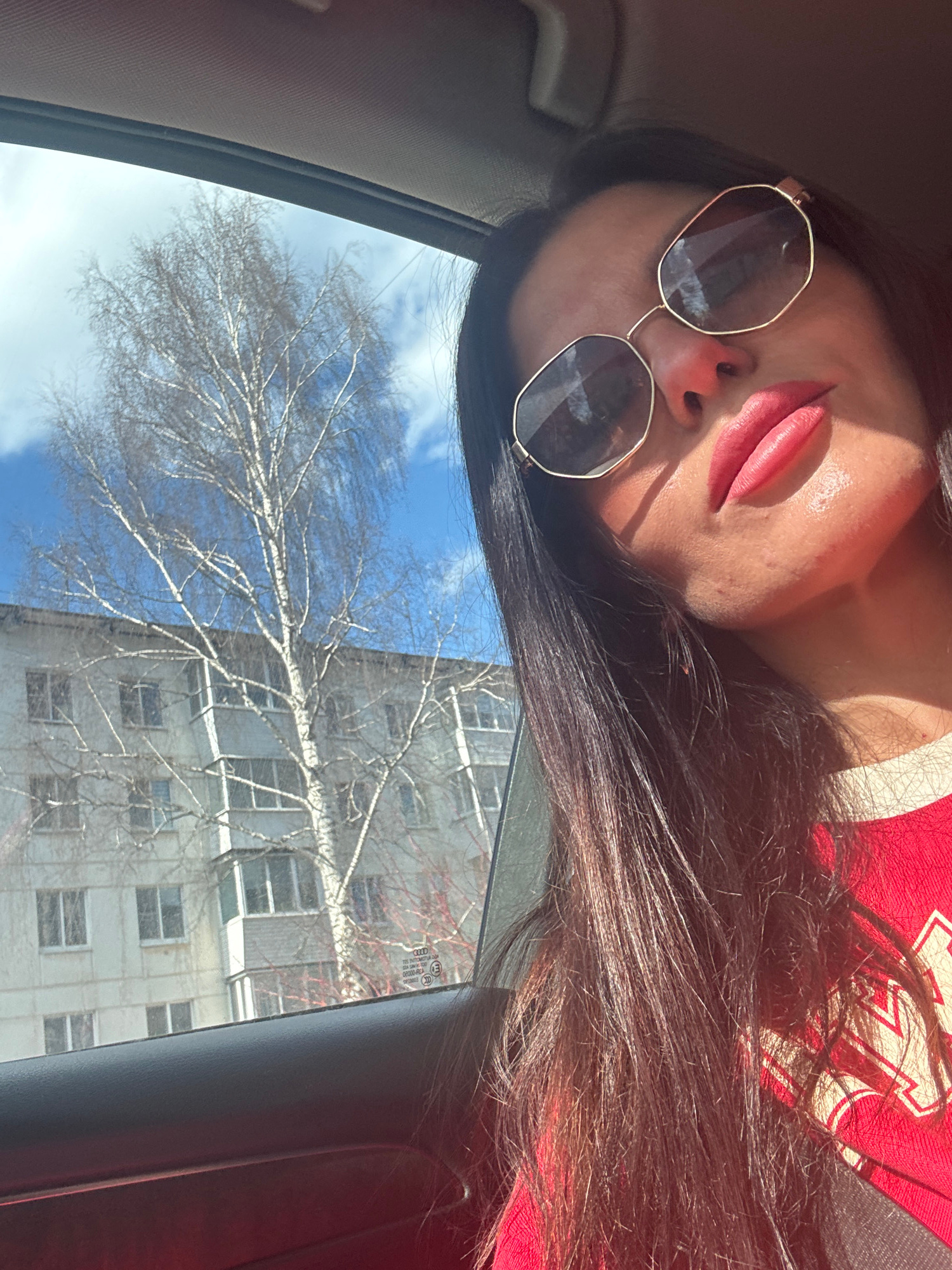 A selfie photo taken from inside a car shows a woman wearing sunglasses and a red shirt with what appears to be a sports team logo. She is positioned in the upper part of the frame. The view outside t…read more