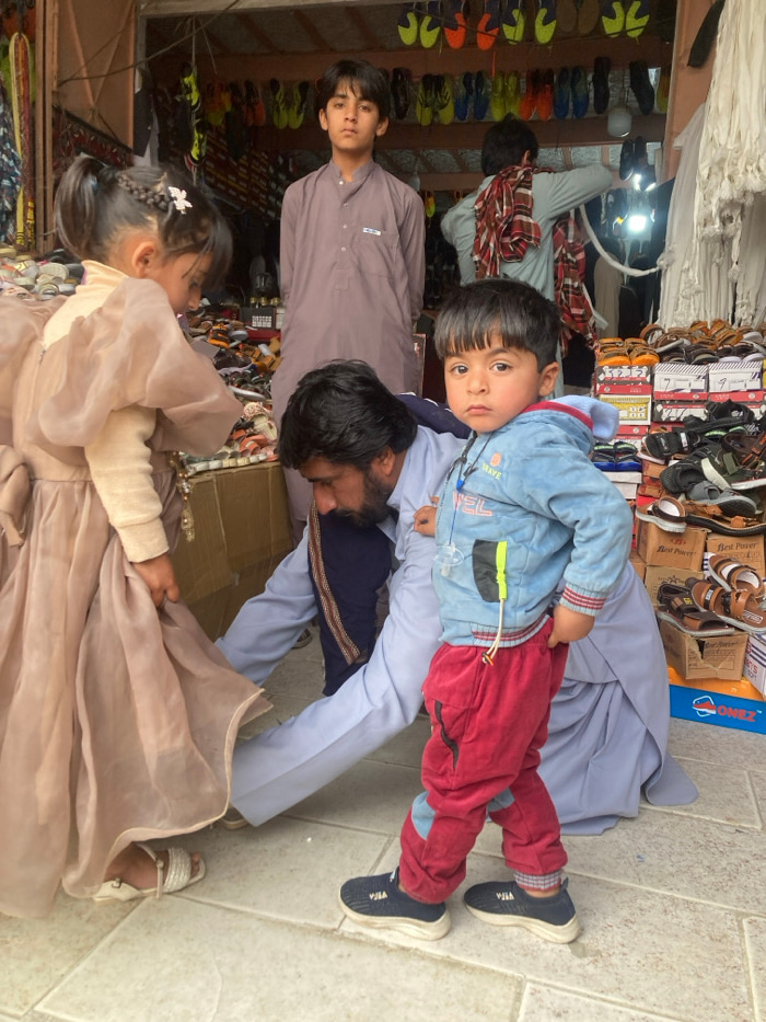 This image captures a scene within a market stall in Taftan, Pakistan. In the immediate foreground, a toddler boy stands facing the viewer, dressed in a light blue hooded jacket with yellow and blackβ¦read more